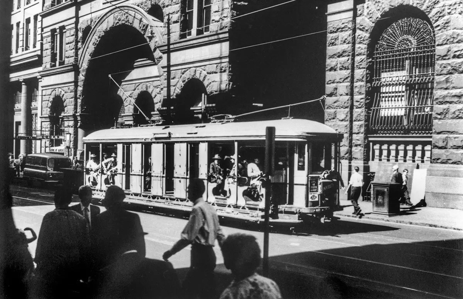 The tram is now replaced by Sydney's light rail. The laneway to the right is the historic Angel Place (home of the 180 bird cages that form the 'Forgotten Songs' art installation).