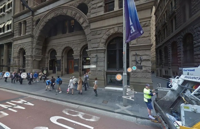 ANZ Bank Chambers, 354-360 George St., Sydney, 1955. The building was officially opened on 11 February 1904 and originally occupied by the Bank of Australasia. The heritage listed building was designed in various stages by Edward Raht, A. K. Henderson, Joseland & Gilling and Kevin Winterbottom and Assoc. and built in various stages from 1902 to 1937 by Loveridge & Hudson and Kell & Rigby. It is also known as ANZ Bank (former); ANZ Bank; United Permanent Building; 2 Martin Place; Paspaley Pearls; 354-360 George Street; and Bank of Australasia.