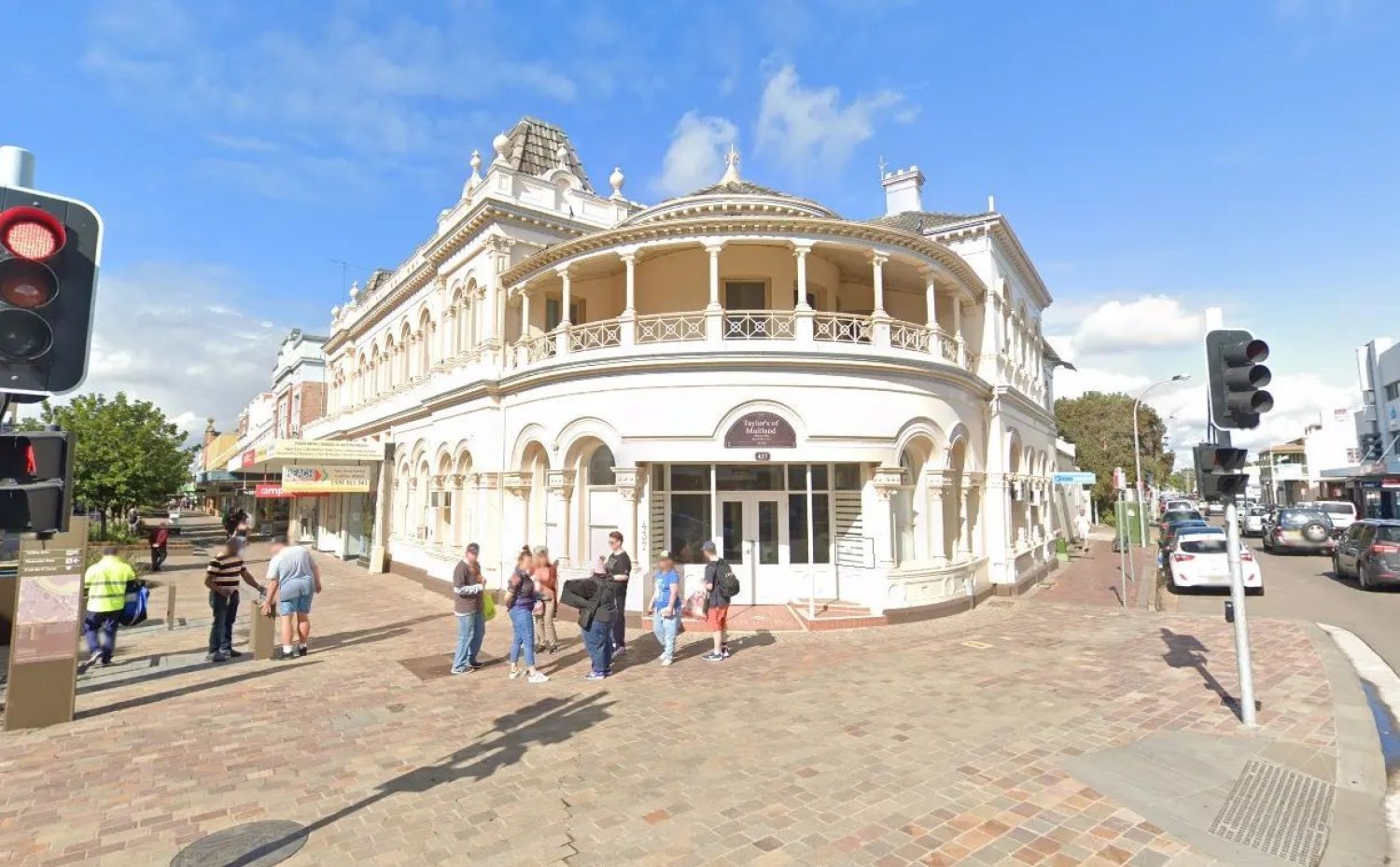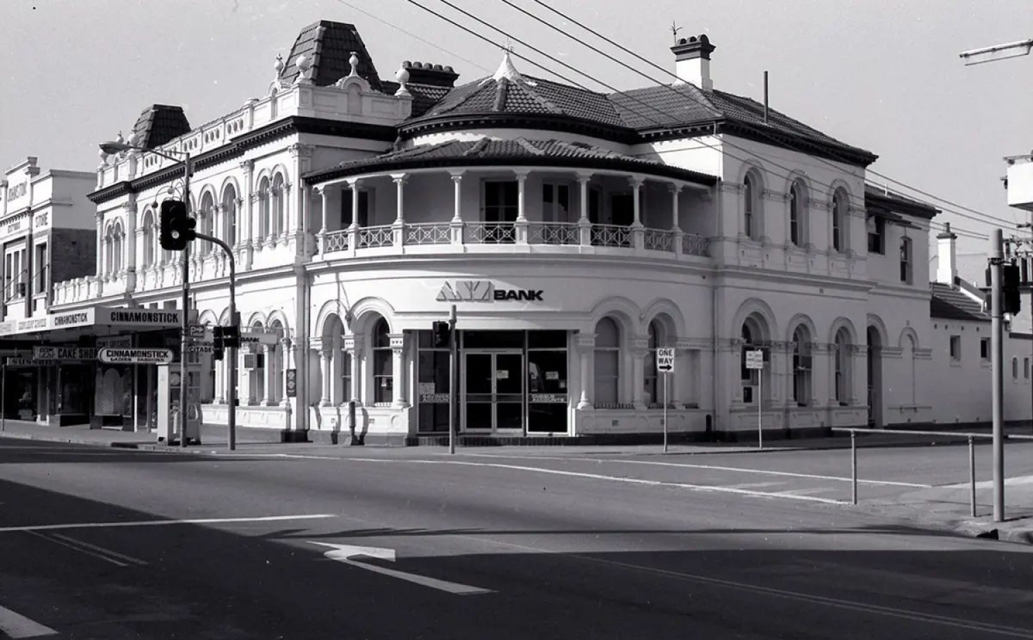 ANZ Bank, West Maitland, August 1979. The ANZ Bank building on High Street at the beginning of The Levee is one of the town's architectural highlights. A rare colonial example of a Byzantine design, it was built in 1869 and features round-headed windows and a two-storey arcaded veranda which bends around the corner into Elgin Street. It is particularly notable for its skilful use of curves which make it stand out from the other buildings on the street (modern photo from Google Maps).