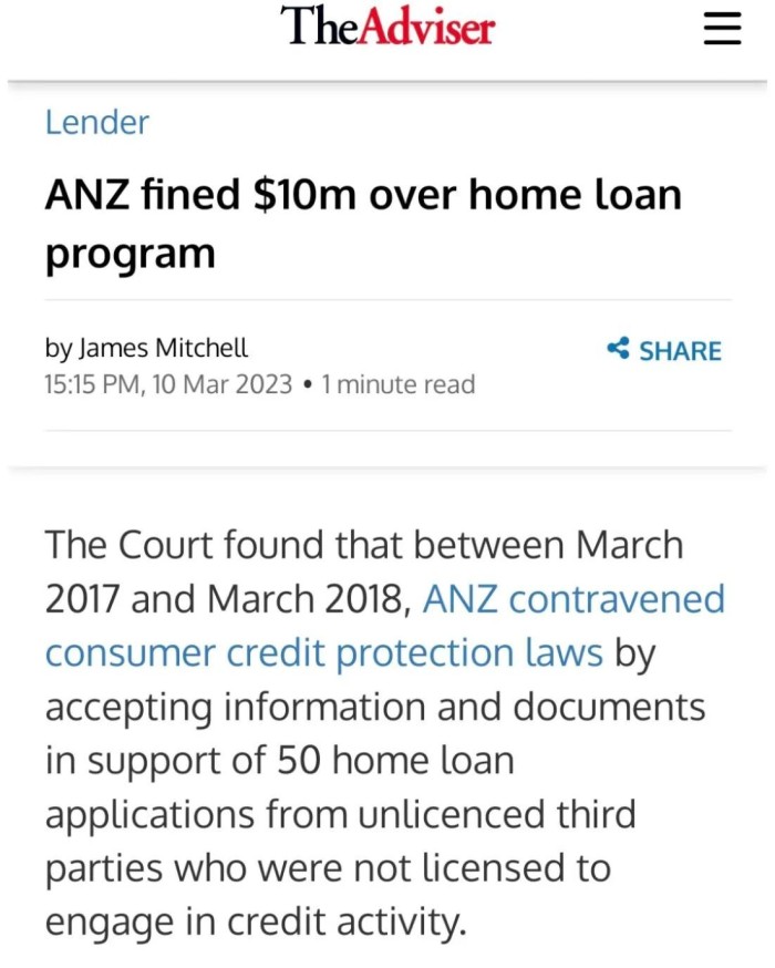 The Adviser published an article today detailing a 10m fine imposed on ANZ as a result of receiving information and/or documents from those not licenced to conduct credit activities.