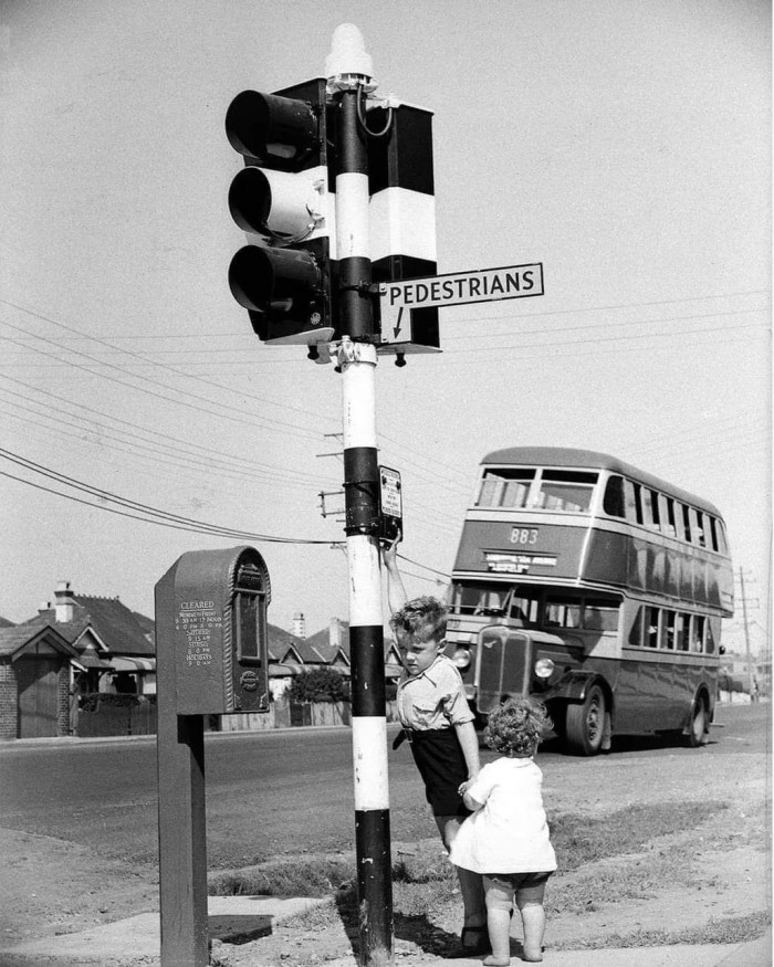 A brother and sister use the new pedestrian lights on Parramatta Road, Ashfield, in February 1939. Source: Fairfax Archives (Keith Rainsford).