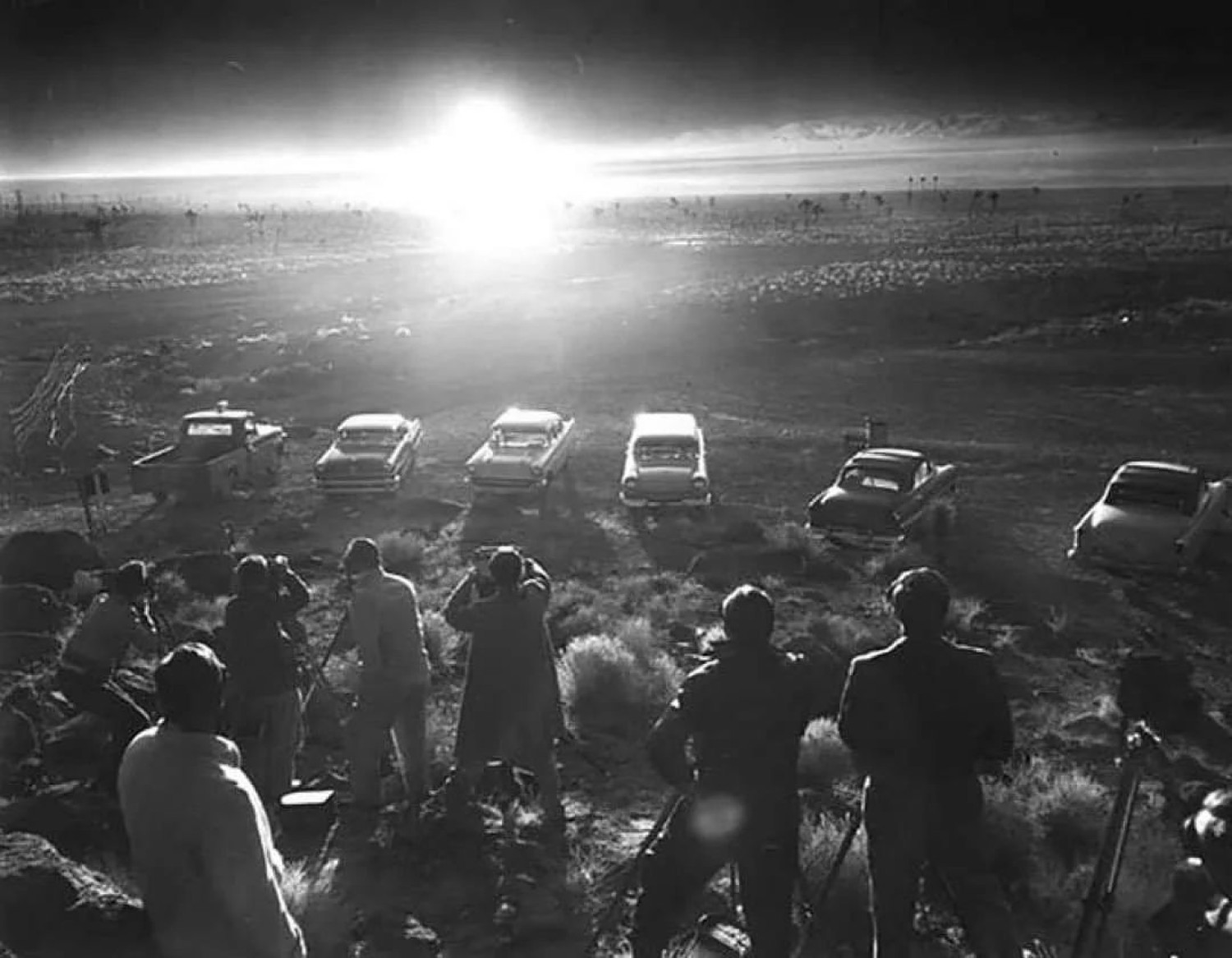 Reporters and photographers observe an atomic bomb test in Nevada, April 22, 1952. Taking in all the atomic goodness.