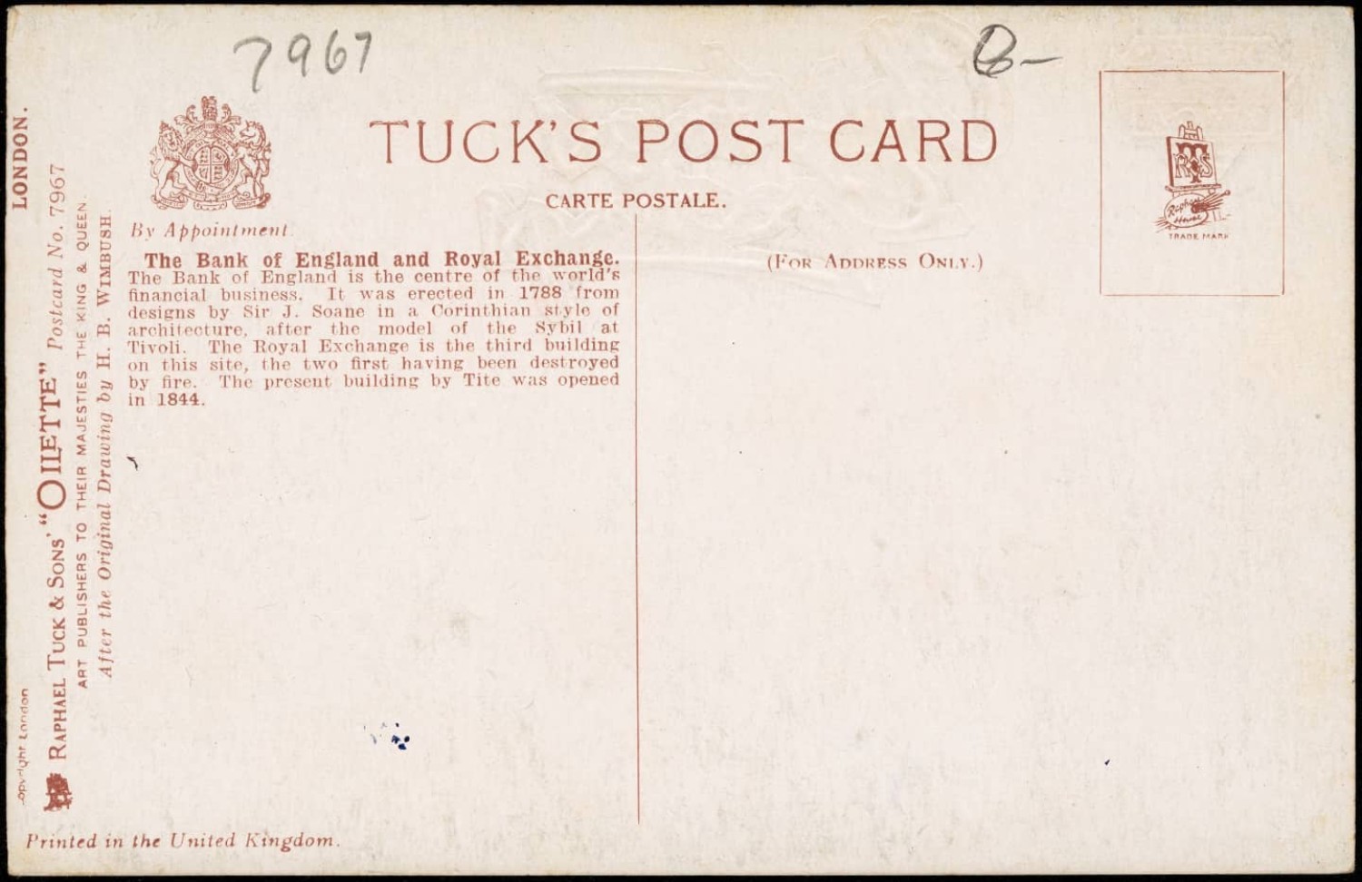The Bank of England & Royal Exchange, London. Christmas Greetings postcard, c1910.