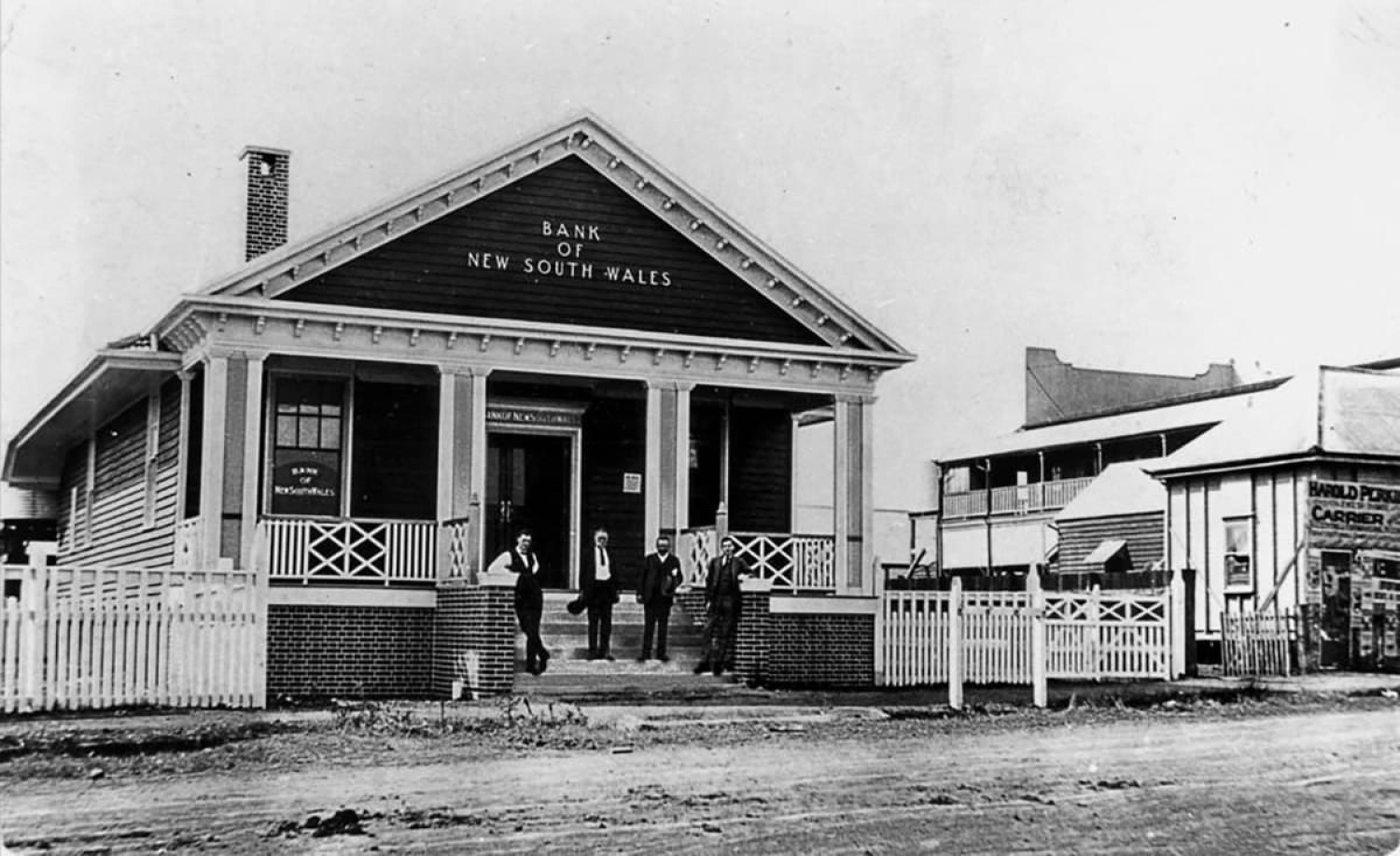 Bank of New South Wales, Lamb Street, Murgon, c1921 (about 225km from Brisbane, QLD). The first European settlers arrived in the Murgon area in 1843, taking up land which is now known as Barrambah Station. Murgon derived its name from a lily pond located on Barambah Station. The rich and fertile land was used for agriculture and dairying. Logging was another prosperous industry. The town didn't start to develop until the early 1900s. Large properties were divided into smaller allotments, and the local population increased. The town was surveyed and the sale of these lots took place in 1906. A butter factory was opened in 1913 and a grain shed was built the following year. Current population of the town is around 2500 people.