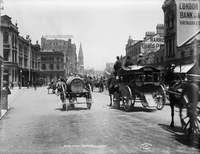 Looking south along George Street, Sydney, from the corner of Campbell Street, c1901. Visible is the Australian Joint Stock Bank (established 1853). A sign for the London Bank of Australia Ltd (651 George Street) and The Home Rule Tobacconist at right.