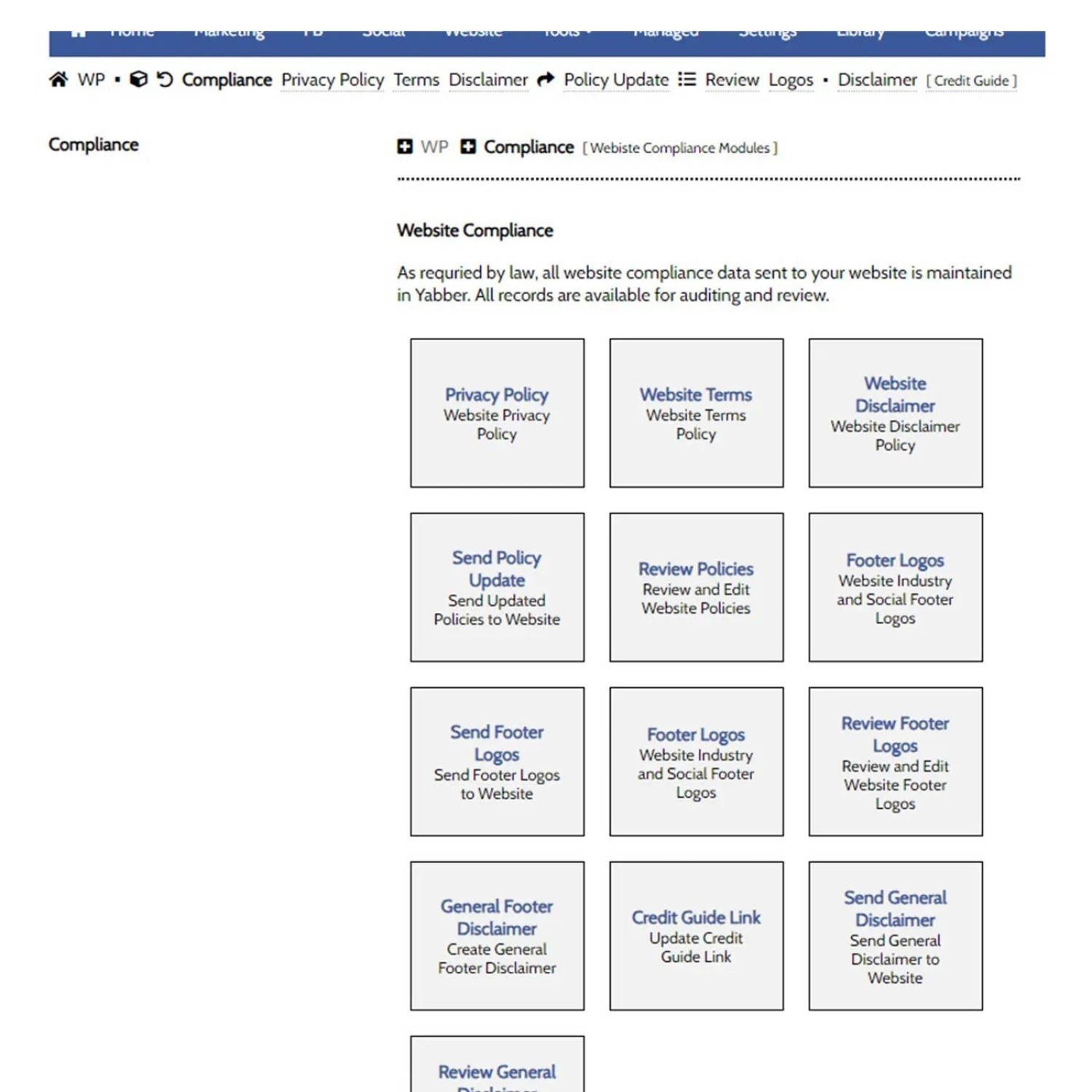 Pictured (sample text only) are selected front page compliance assets (there's a large number of other compliance features associated with other modules). The important feature to be aware of is that all Yabber compliance changes are logged in full in order to satisfy legislated obligations.