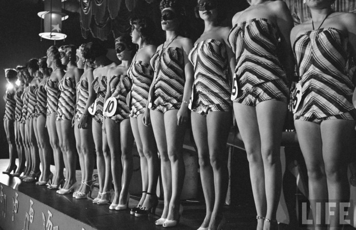 Women participate in a 'Beautiful Legs Competition' in the Casino Gardens Ballroom, Los Angeles, California, September 2, 1949. These photographs were taken by LIFE photographer by Alfred Eisenstaedt.