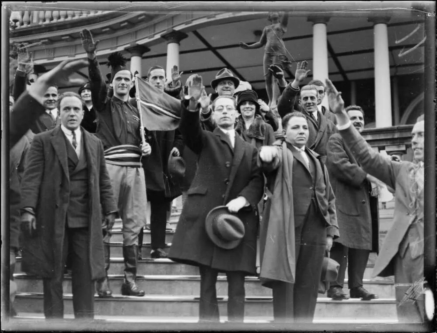 Men giving the Nazi salute on the steps of the Carrington Hotel, Katoomba (West of Sydney), New South Wales, ca. 1934.