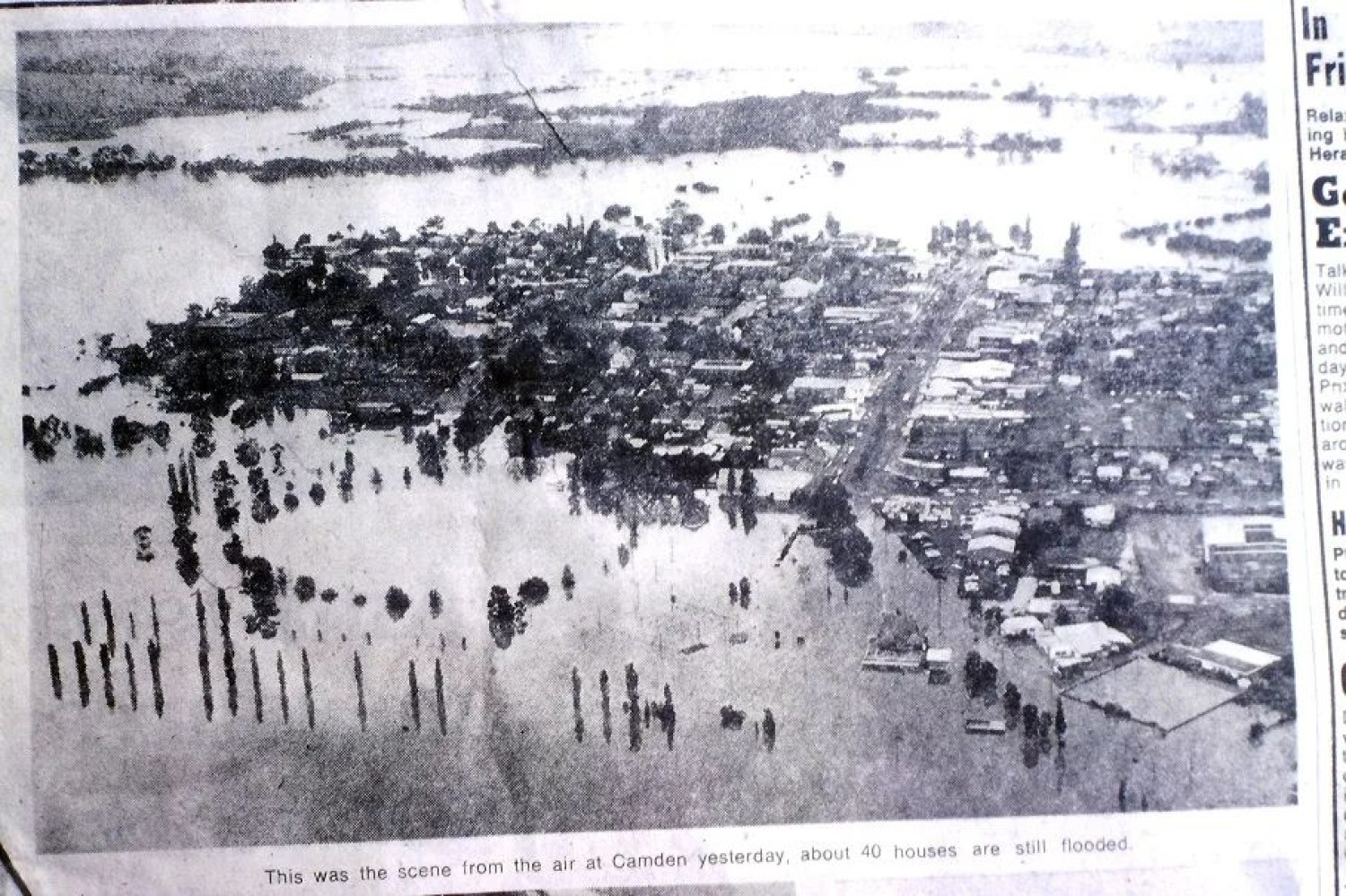 This image of a newspaper photograph shows an aerial view of the Camden township in the 1974 flood event. The Nepean River is towards to the top of the image behind the town centre flowing from R-L.