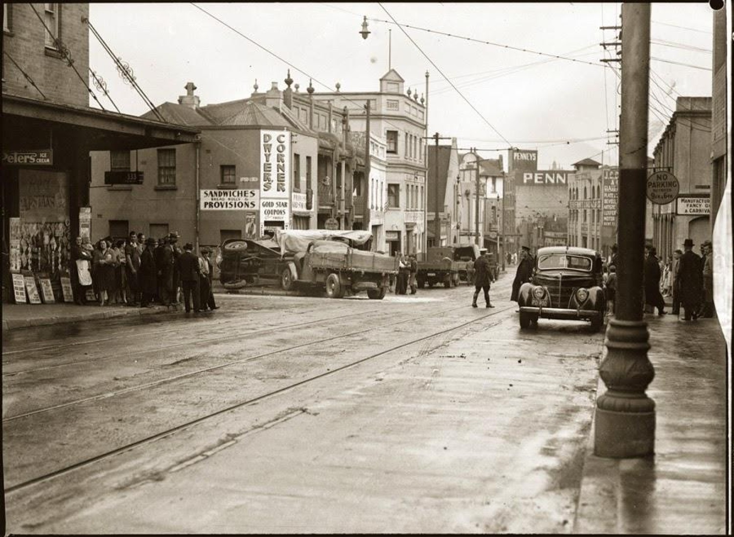 Accident involving two trucks, corner if Balfour and Meagher Streets, Chippendale, Sydney, c1942.