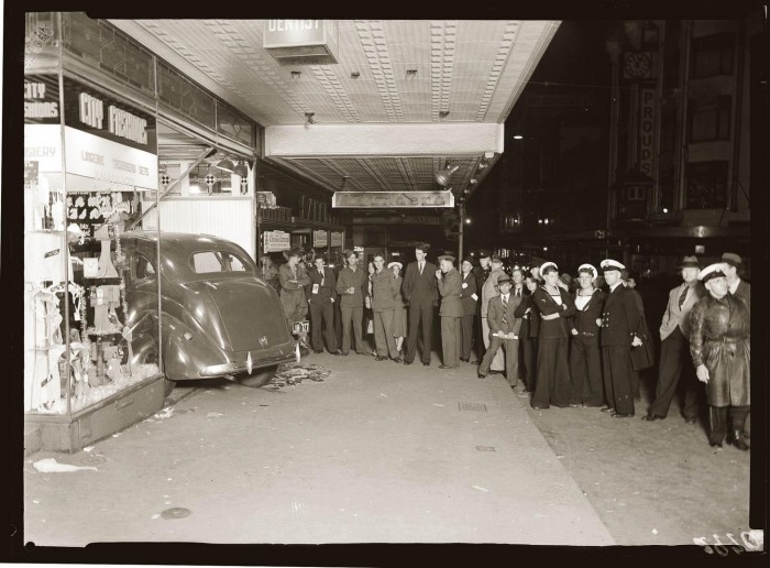 Night-time car accident on Liverpool Street, Sydney, c1940. It was quite normal for crowds of people to gather around accidents, particularly when the vehicle vacated the road.