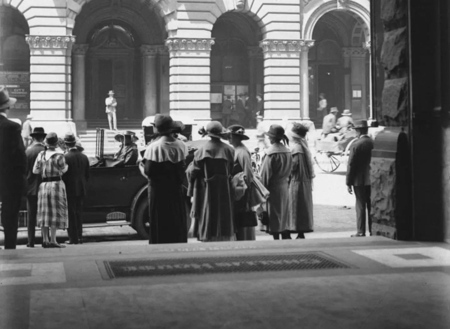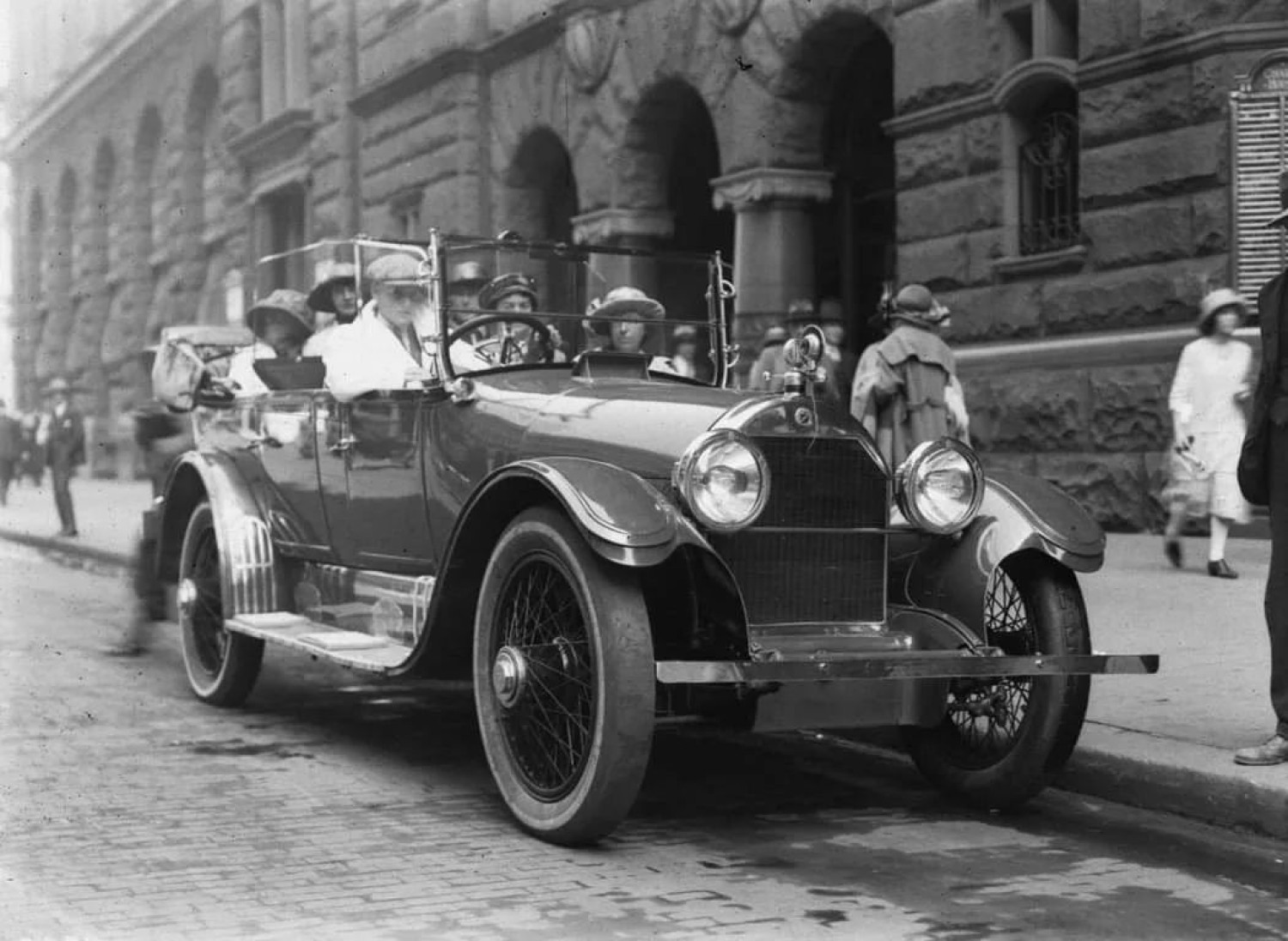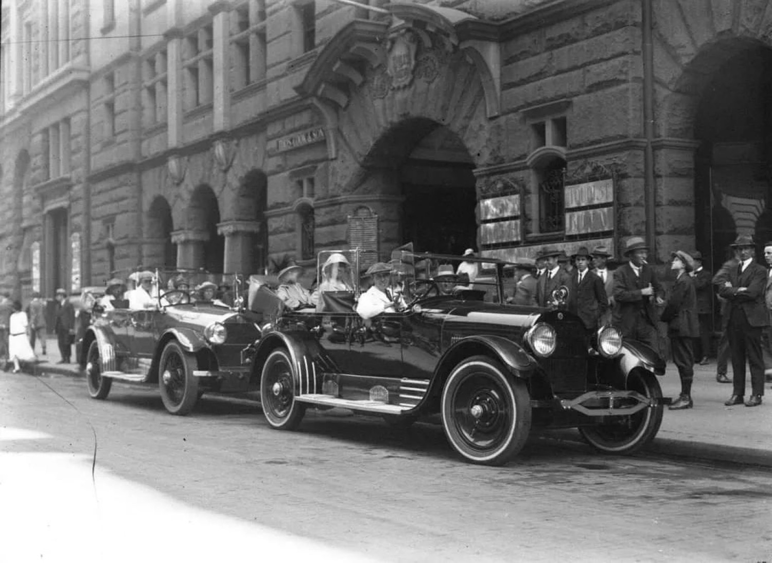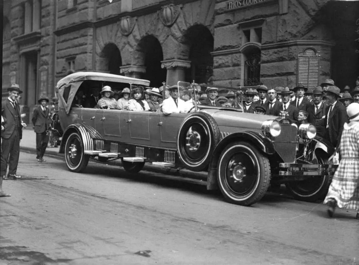 Photographs of a Charabanc Excursion Vehicle taken outside Challis House, Martin Place, Sydney, 1923. Tourists gather ready for the day trip to Jenolan and Blue Mountains.