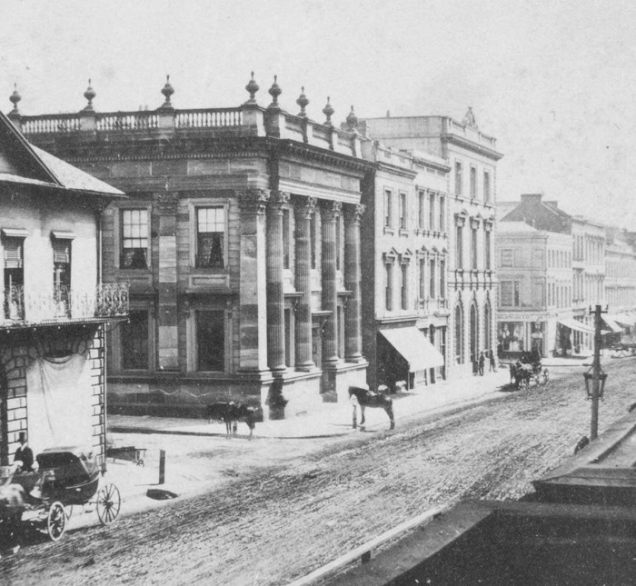 Commercial Bank and the Bank of New South Wales, George Street, Sydney, c1860. Looking north along George St. from the eastern side of the street. On the west side of the street, in the left foreground and standing on the corner of Barrack Lane, is the original David Jones building built in 1838. On the opposite corner of Barrack Lane stands the Palazzo-style Commercial Bank, whose façade was removed in 1923 and reconstructed on the grounds of the University of Sydney .Further north, on the corner of Wynyard Street at the bottom end of Martin Place stands the Bank of New South Wales, which was demolished in 1923.