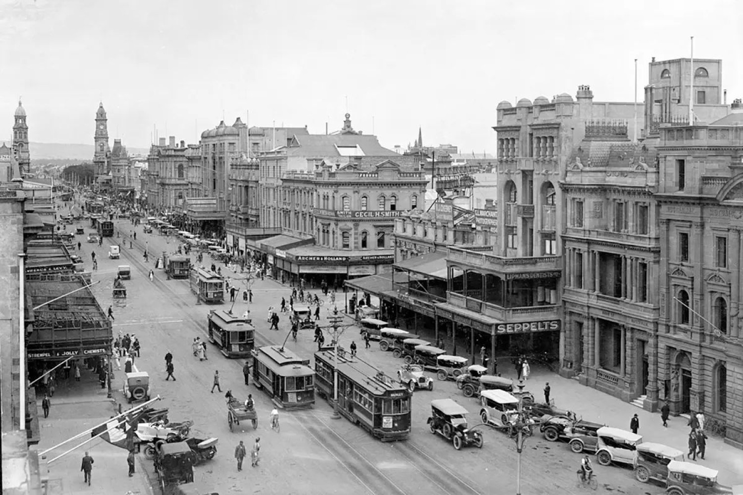 King William Street, its buildings and traffic, looking south towards the Town Hall. The electric tram and the motor car dominate transport in this busy street scene in which pedestrians amble across the road in a leisurely manner. There are also eight cyclists and a couple of horse drawn carts as well. [On back of photograph] 'King William Street / looking south from North Terrace / 1923 / Near side of Commercial Bank (on the right) is 54 yards north of Hindley St.'. Taken in 1923.