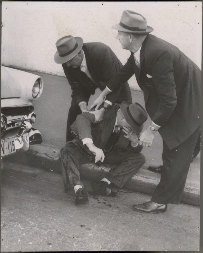 The man sitting on the edge of the gutter, injured and bloodied, is Detective Constable 1st Class K F Gilmour from Darlinghurst Police Station, soon to be promoted to Detective Sergeant.
