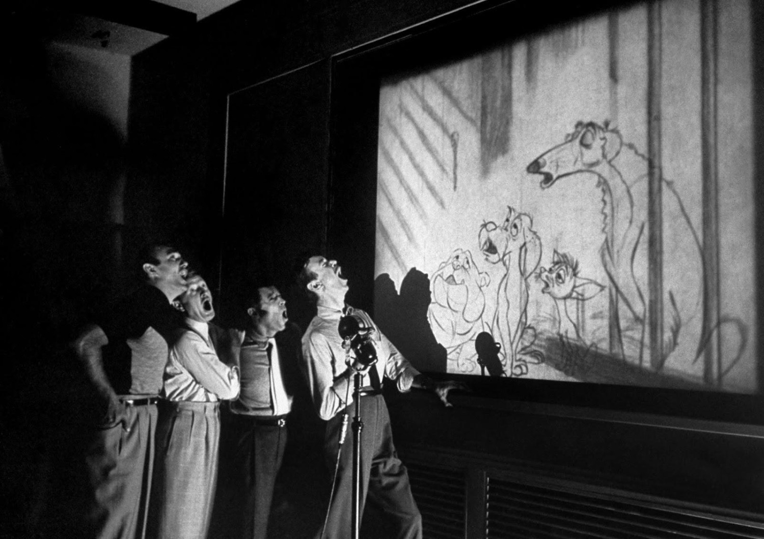 A Disney Quartet known as 'The Mello-Men' bays in harmony before screen showing four canine characters whose voices they represent in the forthcoming Disney feature cartoon, 'The Lady and The Tramp', 1953. Photo: Alfred Eisenstaedt, TheLIFE Picture Collection.