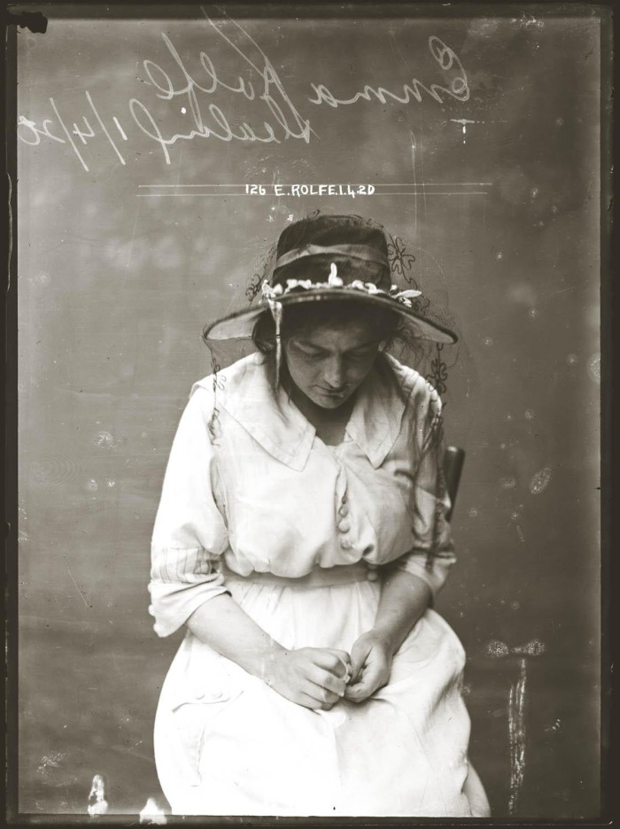 Titled "Mug shot of Emma Rolfe (also known as May Mulholland, Sybil White, Jean Harris and Eileen Mulholland), 1 April 1920, Central Police Station Sydney.".
