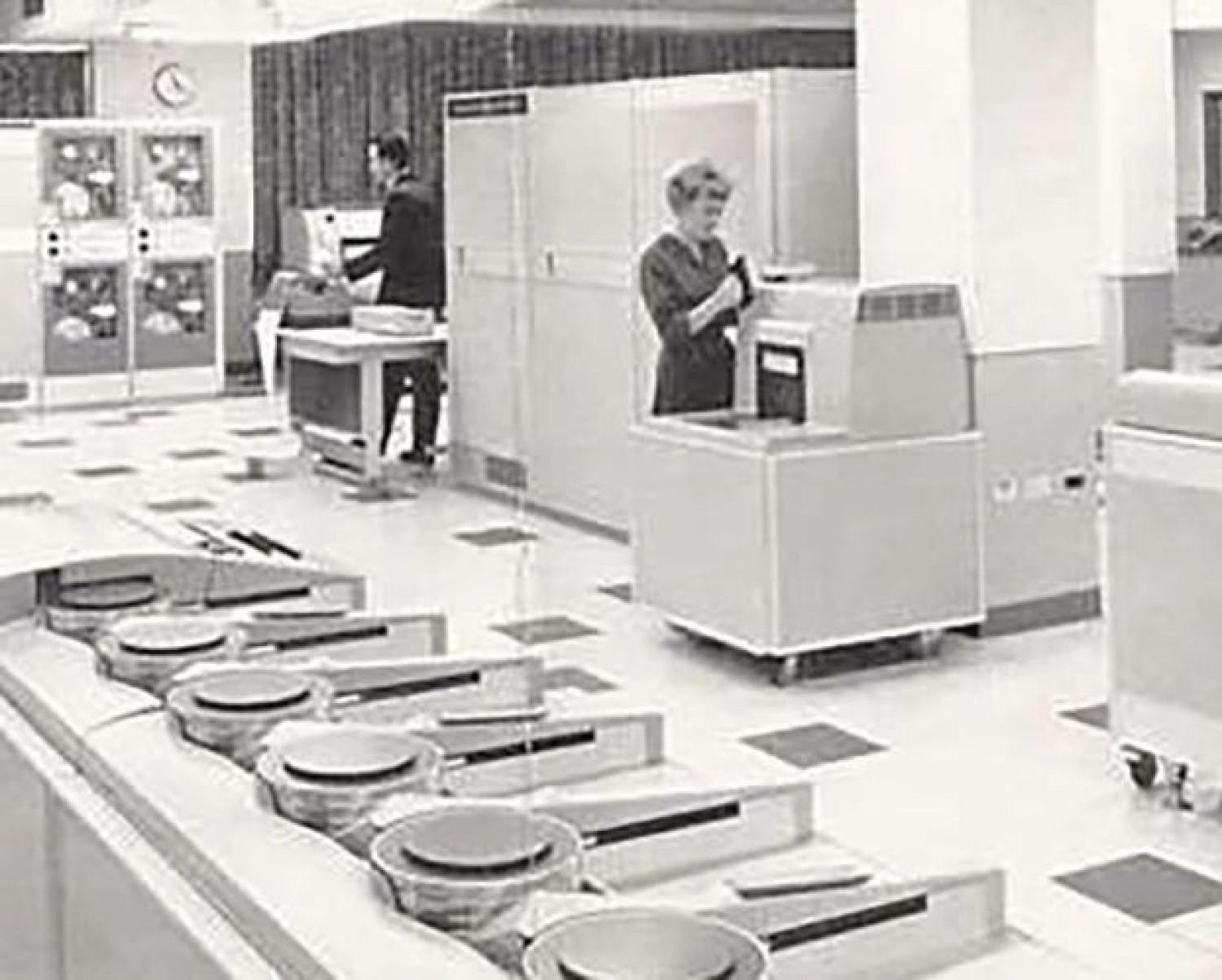 Cheques and deposits from nearby branches were brought via exchange cars to the GE225 for processing, and the processed records were returned to each branch the same way every day. For the majority of branches, cheques were delivered and returned by mail.