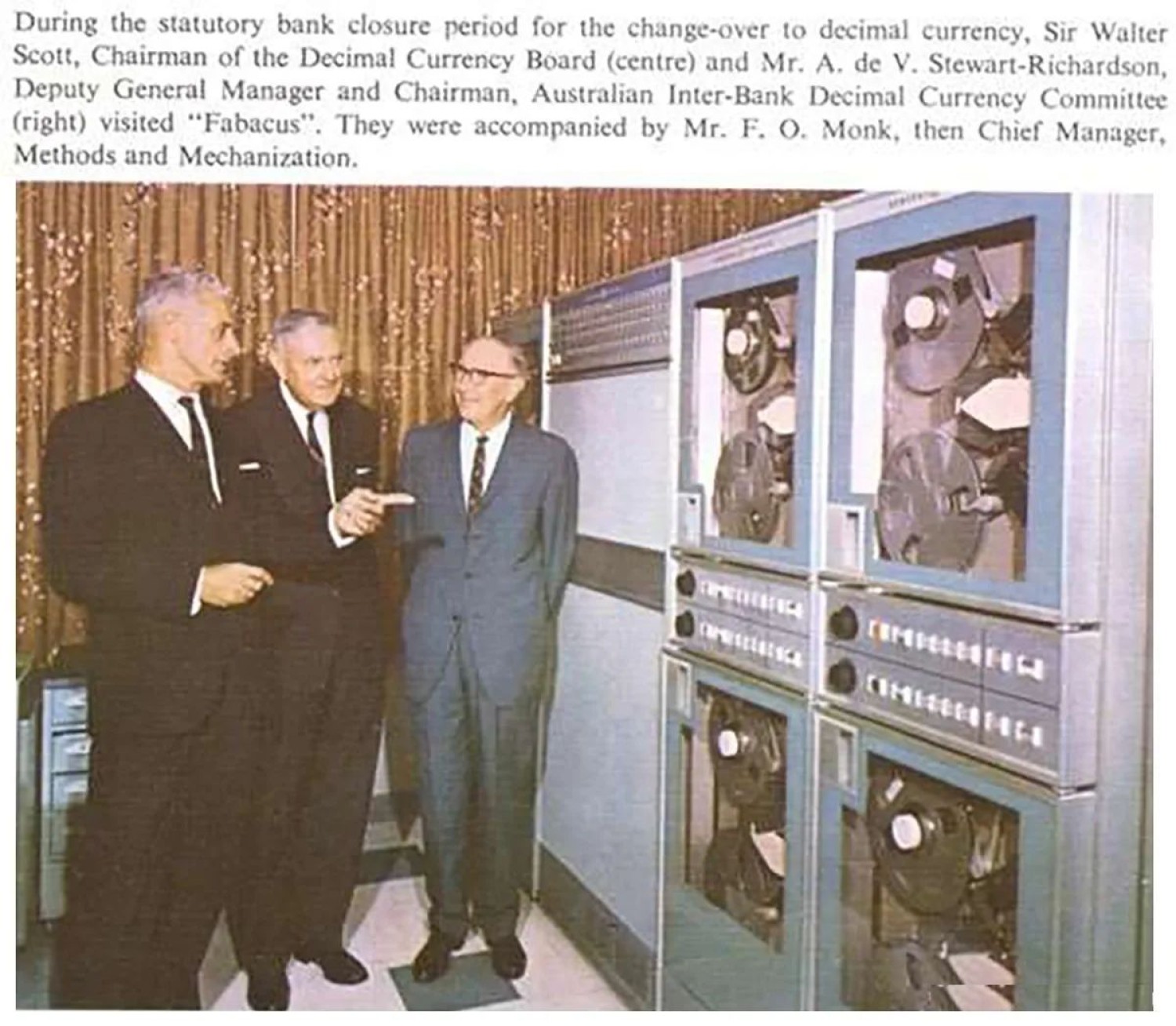 The GE225 - or the FABACUS (First Australian Bank's Accounting Computer Used in Sydney), as it came to be known - was the size of three wardrobes and had 20 kilobytes of core memory. It was installed on Level 9 of "The Wales House" building, which is now the Radisson Hotel. It was essentially a punch card operation - the programs were stored on punch cards that were fed into the computer from a reader. Data was captured by cheque readers connected to the computer which scanned the MICR (Magnetic Ink Character Recognition) encoding on the bottom of cheques, and stored the data on inch reel tapes. The cheque readers also performed the function of sorting cheques in order for them to be returned to their relevant branch.
