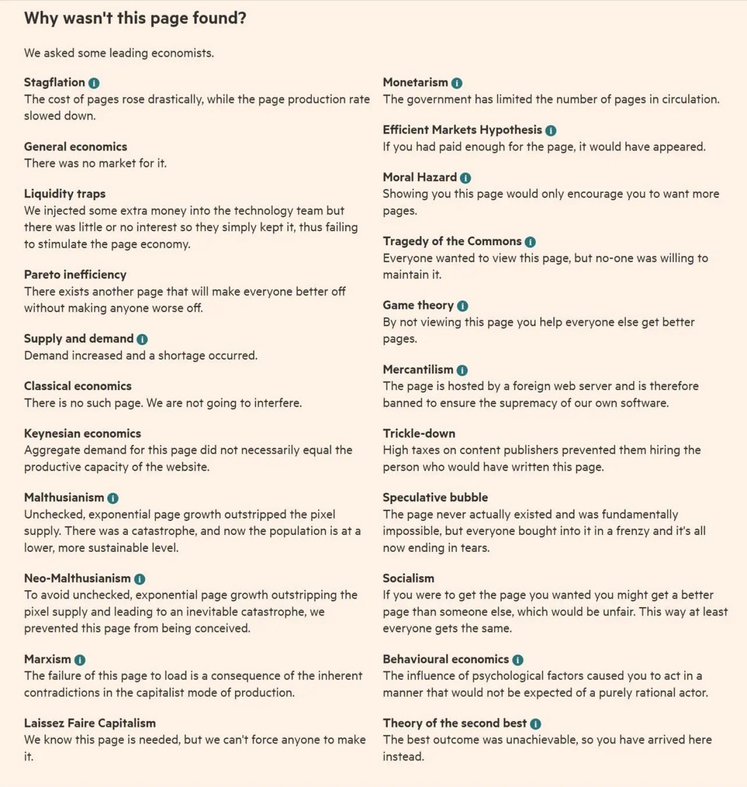 The 404 'Not Found' text from the Financial Times. An indicator of a good error page might be one that people share (and is more popular than actual website content)!