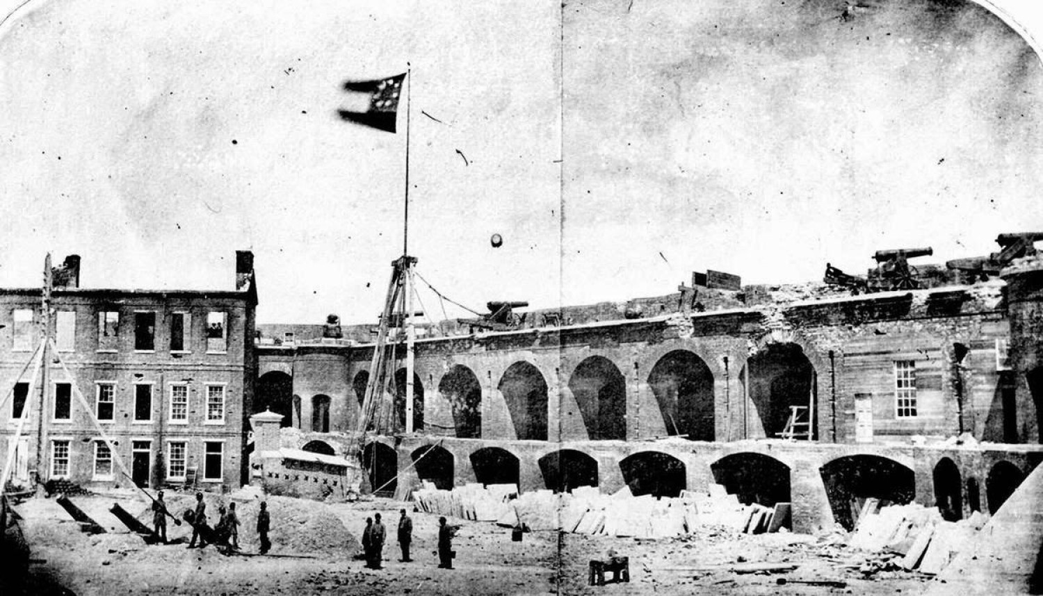Fort Sumter, South Carolina, April, 1861, under the Confederate flag. The first shots of the Civil War took place here, on April 12, 1861, as Confederate batteries opened fire on the Union fort, bombarding itfor 34 straight hours. On April 13, Union forces surrendered and evacuated the fort. Union forces made many attempts to retake the fort throughout the war, but only took possession on February 22, 1865, after Confederate forces had evacuated Charleston.