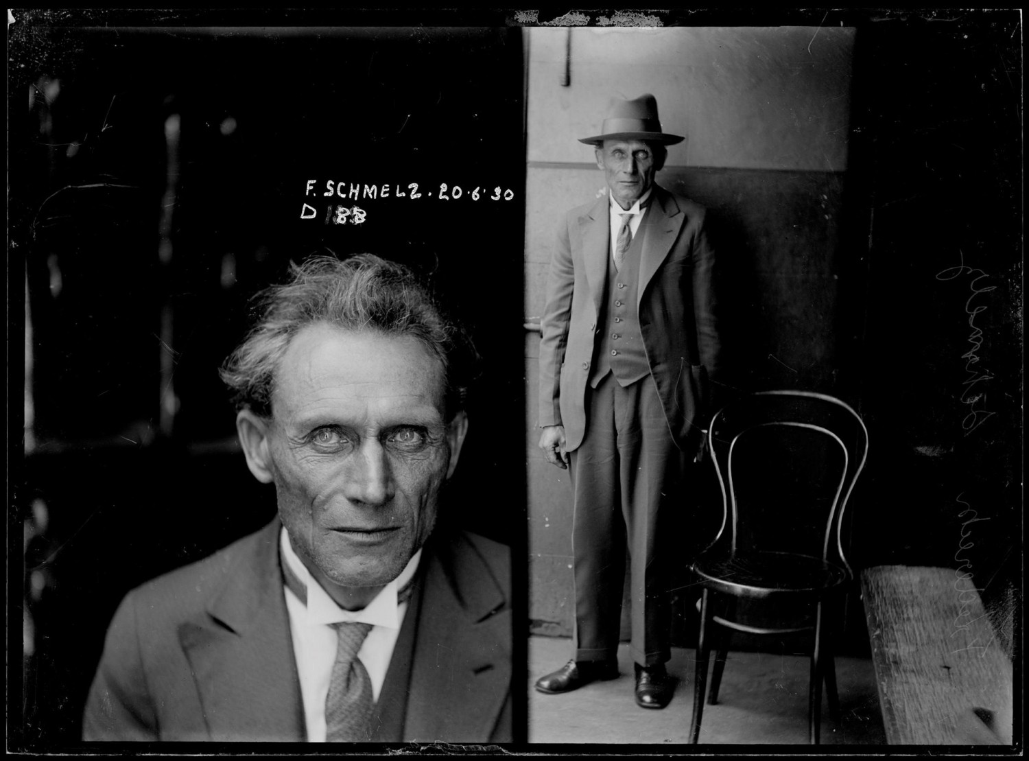 Titled "Frederick Charles Schmelz, Special photograph number D88, 20 June 1930, probably Central Police Station, Sydney."