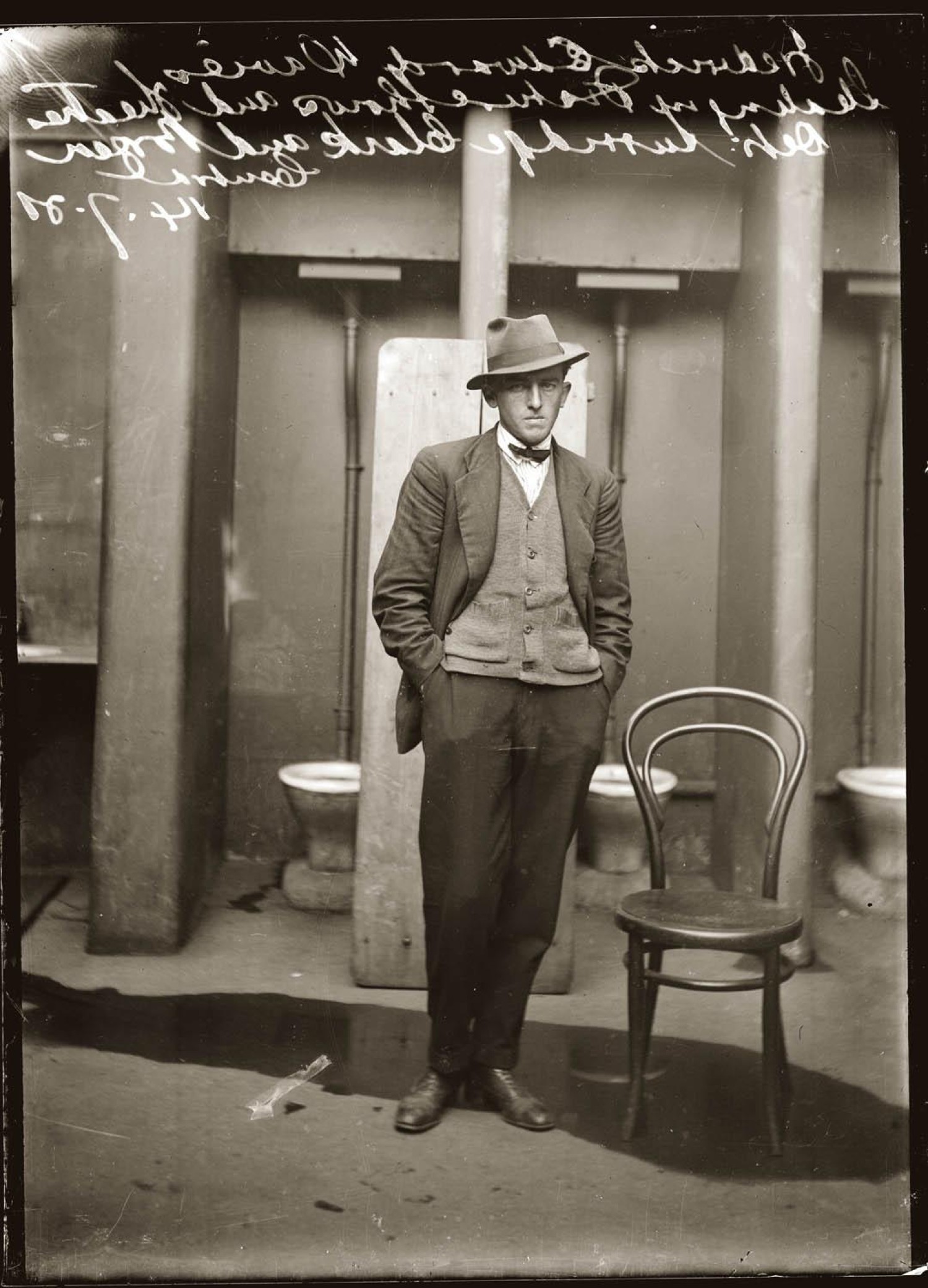 The handwritten inscription on this unnumbered Special Photograph reads 'Frederick Edward Davies stealing in picture shows and theatres DetsSurridge Clark and Breen Central 14-7-21'. Police held sneak thieves in particularly low regard, which may account for the decision to photograph Davies in front of the police station's toilet stalls.