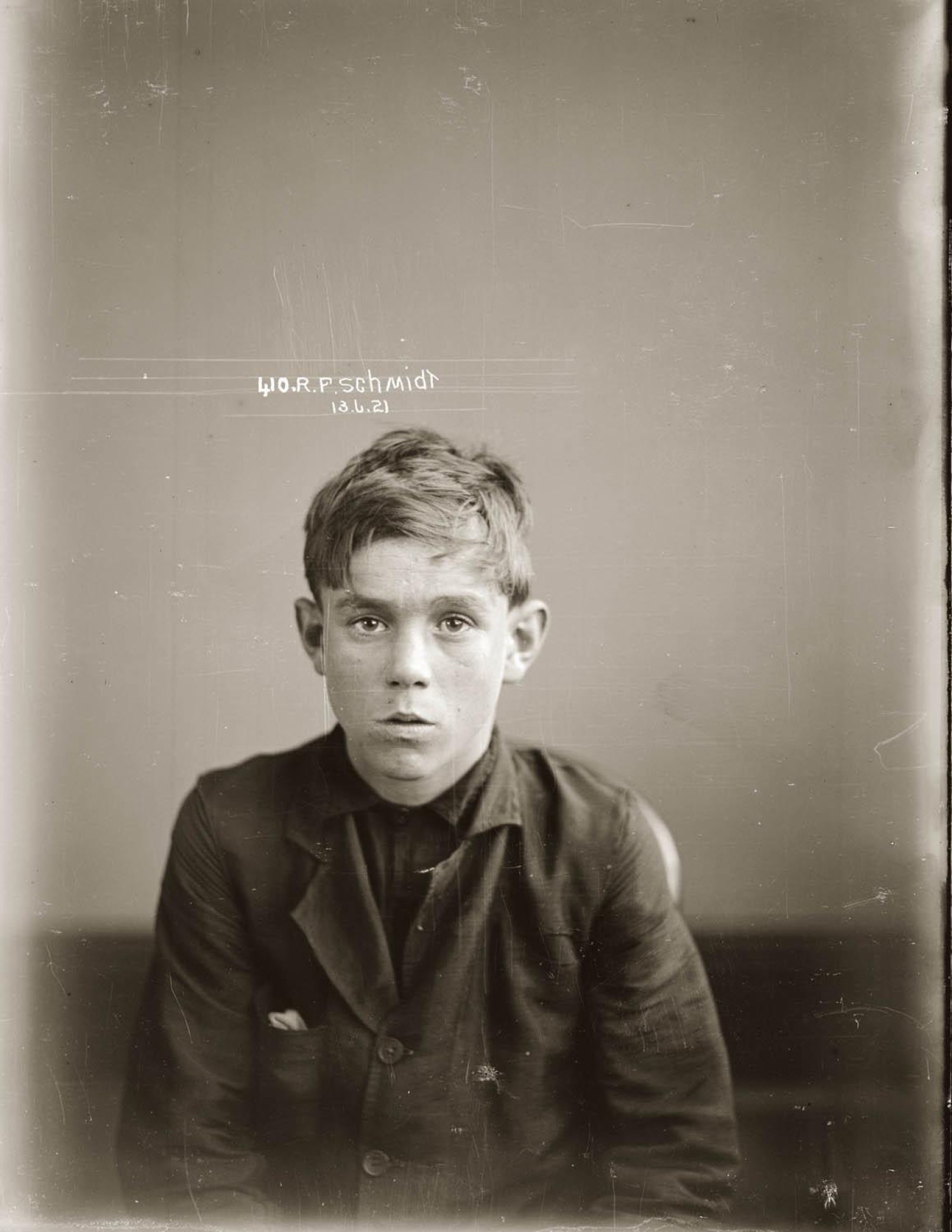 Special photograph no. 410. No entry for Schmidt is found in the NSW Police Gazette for this year. Titled "Mug shot of Ronald Frederick Schmidt, 13 June 1921. Location and details unknown." Source: Sydney Living Museum (Justice & PoliceMuseum).