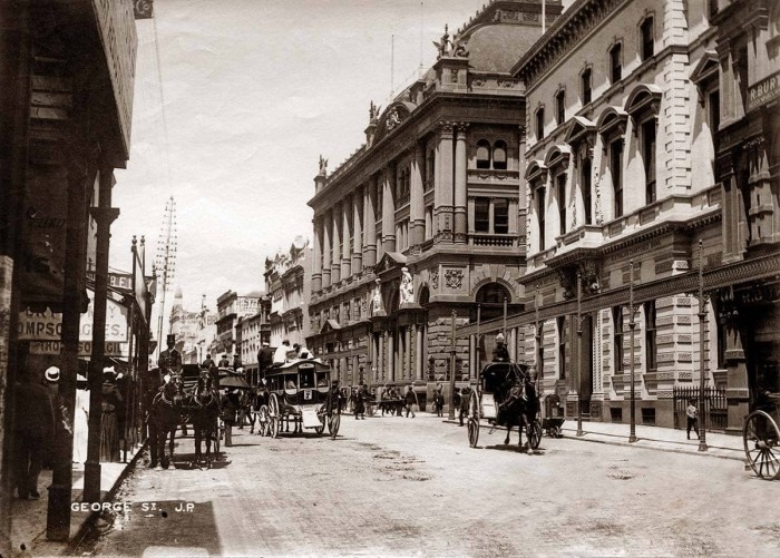 George Street looking south from near the corner of King Street Sydney, 1890. A sign for Thompson & Giles (Denison House) is at left and the Australian Joint Stock Bank (369-373 George Street), later the Bank of Commerce and Bank of NSW (with statues, now demolished) at centre. The English, Scottish & Australian Chartered Bank (367 George Street) is at right. Source: Sydney City Archives.