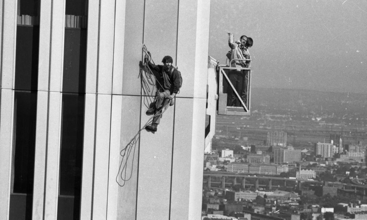 Willig visited the World Trade Center a year before the stunt and took measurements for the equipment he would need. He made special clamps that fit into the window washing tracks of the South Tower. The clamps he designed would lock intoplace when they were pulled down by his body weight. They would release when he decided to raise them. Once he built the equipment, he went to the World Trade Center 4 to 5 times at night to test the equipment. He began his climb at 6:30 a.m. that Thursdaymorning. As he was climbing, two police officers, one a suicide expert, were lowered in a window washing basket to try to get Willig to give up. Willig swung away from the officers so they could not grab him. Willig and the officers talked, and the suicideexpert realized that Willig knew what he was doing and was not a threat. The officer passed him a pen and paper, and Willig signed it "Best Wishes to my co-ascender." Police helped him to the top of the tower, by pulling him through a tiny window hatch at10:05 a.m. and he was arrested. Willig said he could hear the crowd cheering from ground level. His climb received plenty of attention because it took 3 hours to complete, allowing news cameras and spectators to gather. The only significant problem Willigran into was irregularities in window washing tracks. However, he was prepared for this because he brought a small hammer to fix the irregularities. He signed his name and the date on a piece of metal on the observation deck of the South Tower, which was stillvisible until the tower was destroyed on September 11, 2001.