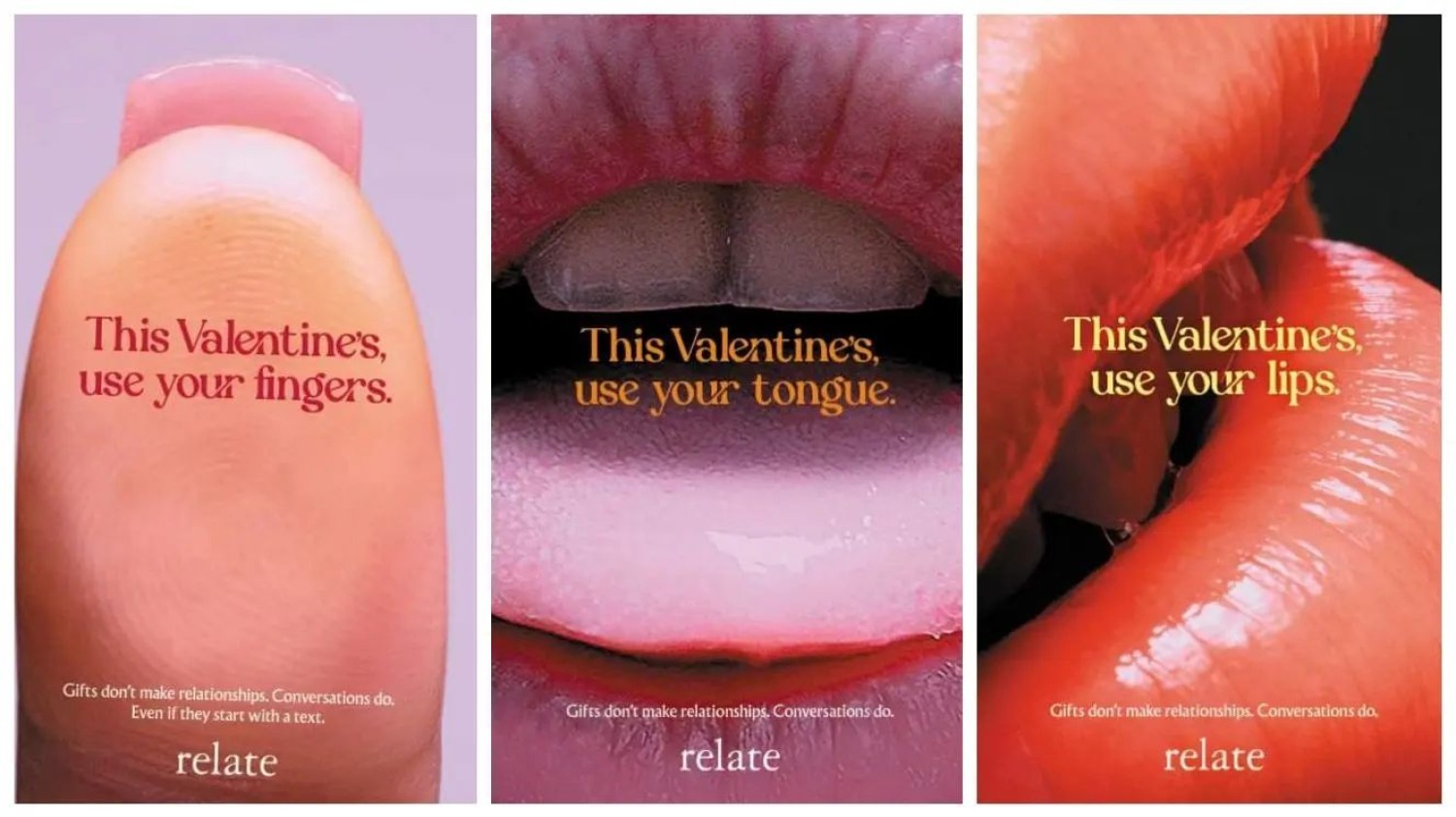 The sensual posters remind people not to underestimate the gift of honest, authentic connections. ... #beliefmedia #creativematters #linkedincompany #ogilvy #relate #advertising #valentinesday #marketing [title: Gifts Don’t Make Relationships, from Ogilvy for Relate]