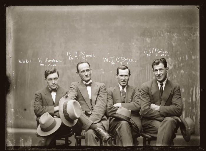 Titled "Mug shot of Hampton Hirscham,Cornellius Joseph Keevil, William Thomas O'Brien and James O'Brien, 20 July 1921, Central Police Station, Sydney."