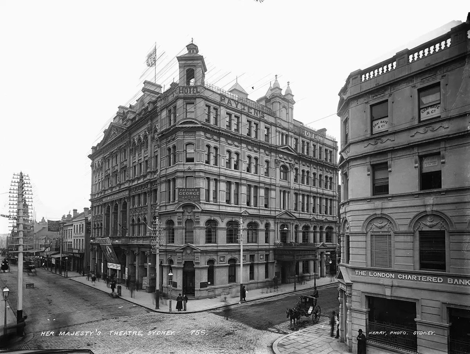 The five-storey building containing Her Majesty's Theatre, Payten's Hotel and the Australian Banking Company is depicted in the centre of the image.