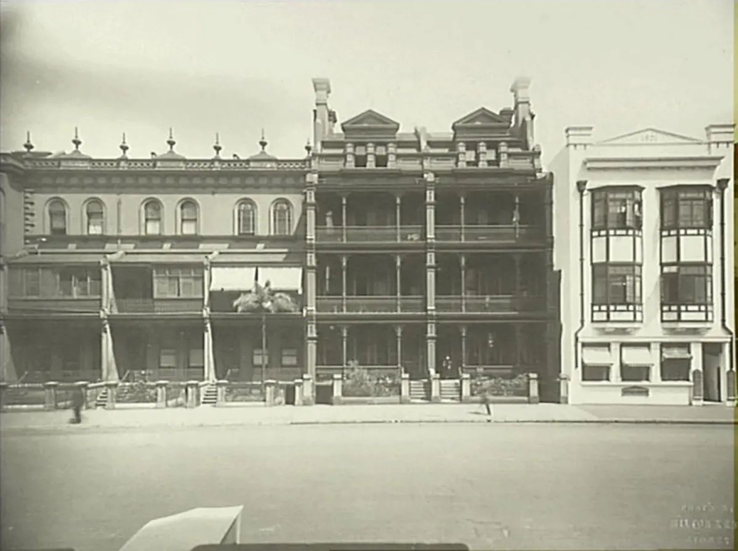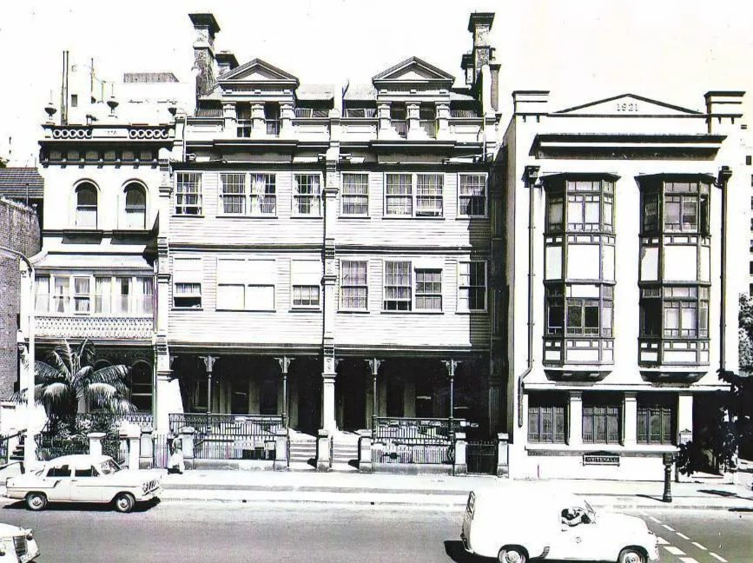 By the mid-1870s, following the demolition of the church and school, a row of three three-storey Italianate terrace houses known as "Lucretia Terrace" was erected (c1876). The Georgian house was later demolished and two four-storey late Victorian terrace houses were erected (1891). Around 1875 the Georgian cottage was demolished, and the cottage next door and two three-storey terraces were built; one of these was demolished in 1921 and a three-storey brick building known as "Whitehall" was erected on the site (pictured).