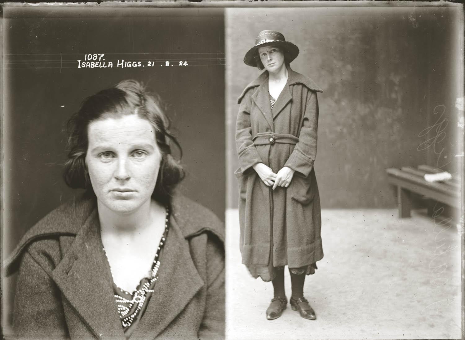Related: see also "Mug shot of Nancy Cowman" and "Mug shot of Vera Crichton". Titled "Mug shot Isabella Higgs, 21 February 1924, Central Police Station, Sydney."