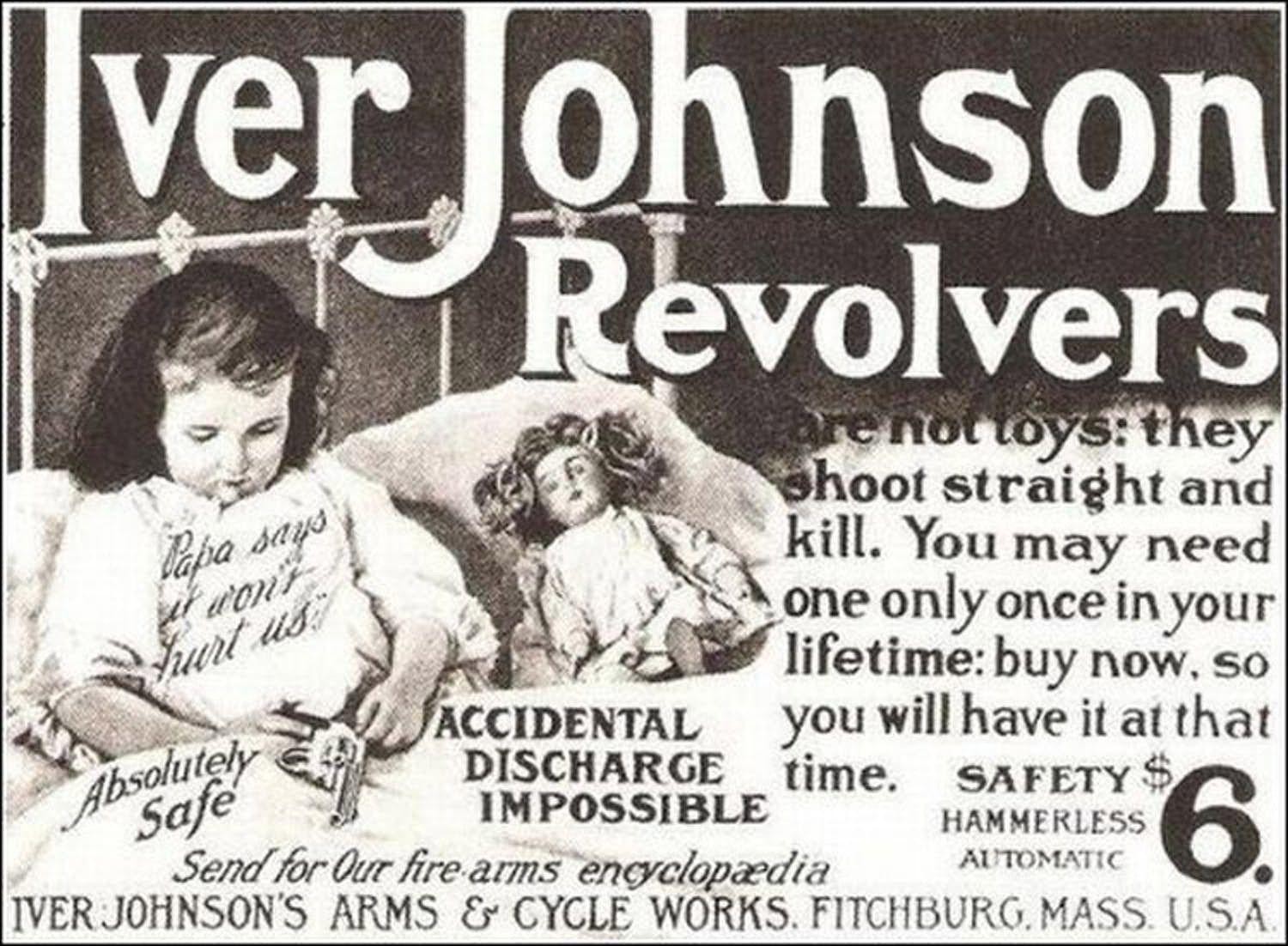 "Papa says it won't hurt us" and "Accidental discharge impossible" were taglines used byIver Johnson Arms to sell a gun that they seemingly wanted your children to play with. This advertisement forIver Johnson revolvers, circa 1904, made no bones about the deadliness of the weapons, but claimed its "hammerless automatic" model was safe enough to be used as a child's toy (because we all know that they don't like pulling triggers).