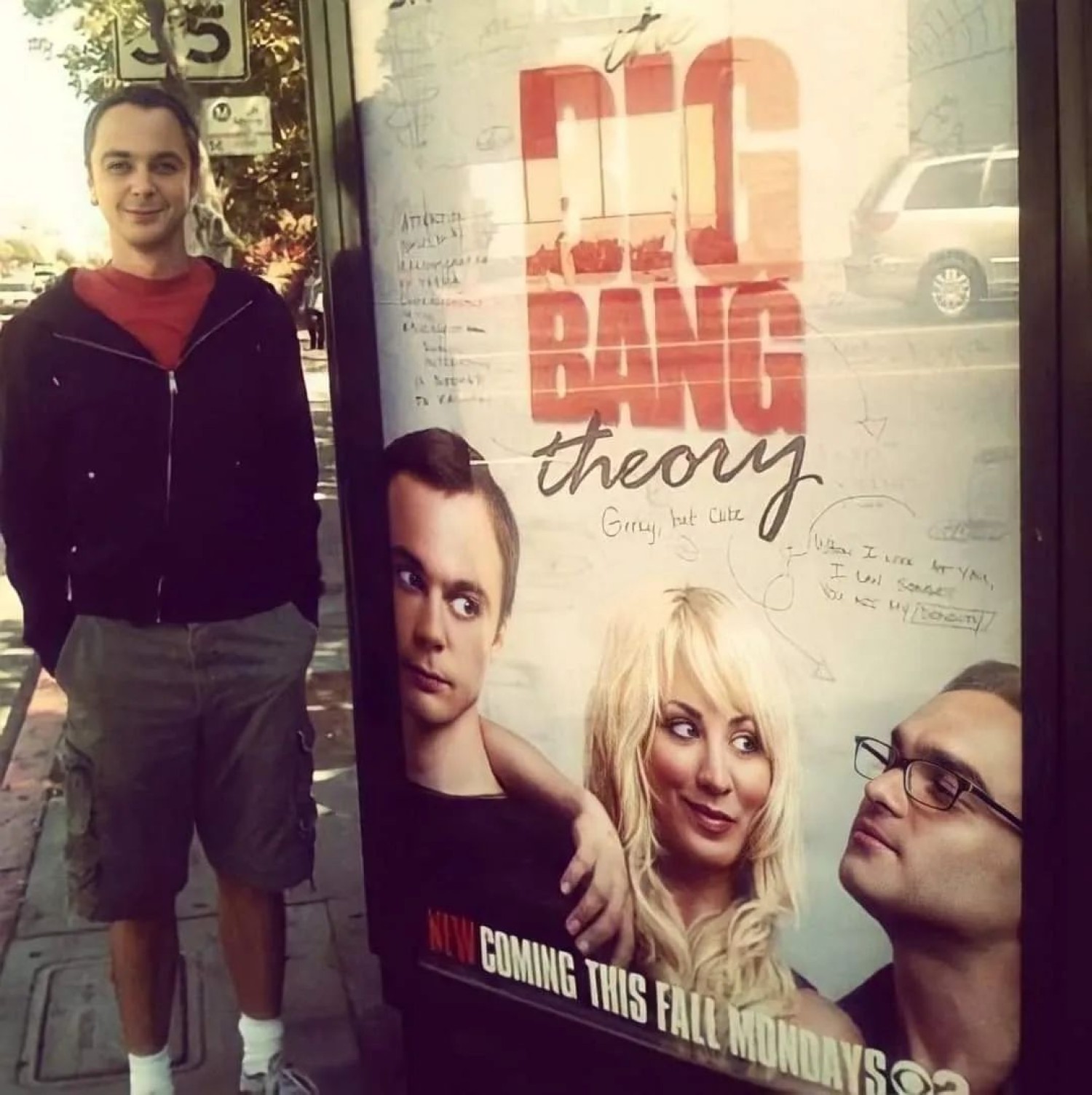 In 2007, weeks before The Big Bang Theory debut, Jim Parsons, until then an almost-unknown actor, took this photo after shooting his face printed on a promotional poster for the first time.