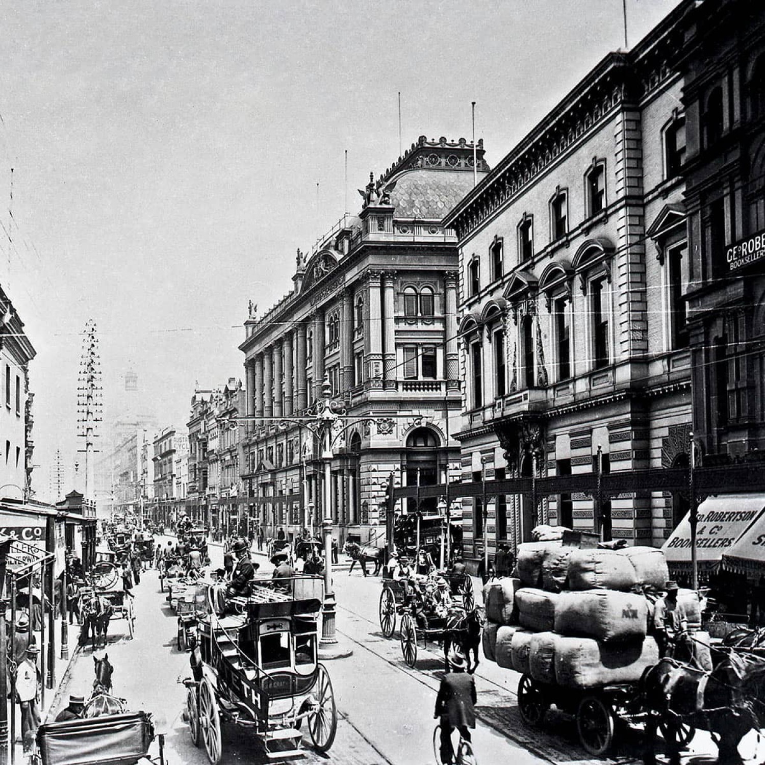 Looking south along Sydney's George Street from near the corner of King Street, 1900. The Australian Joint Stock Bank (369-373 George Street), later the Bank of Commerce and Bank of NSW (with statues, now demolished) at centre. The English, Scottish & Australian Chartered Bank (ES&A Bank) (367 George Street) is on corner.