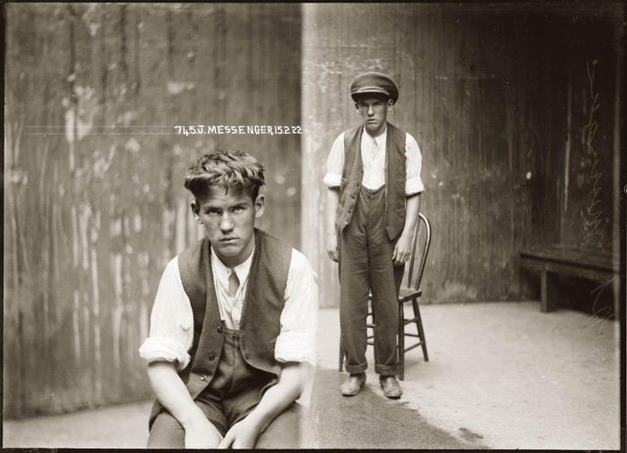Special Photograph no. 745. Joseph Messenger and Valerie Lowe were arrested in 1921 for breaking into an army warehouse and stealing boots and overcoats to the value of 29 pounds 3 shillings. The following year, when this photograph wastaken, they were charged with breaking and entering a dwelling. Those charges were eventually dropped but they were arrested again later that year for stealing a saddle and bridle from Rosebery Racecourse. As an adult Messenger was active in inner-Sydney underworldthrough the 1920s, and he appears in the NSW Criminal Register (16 July 1930 entry no 171) as a seasoned criminal and gang affiliate. The description of his modus operandi includes, 'Violently [resists] arrest ... frequents wine saloons, billiard rooms, andracecourses ... consorts with prostitutes.' This photograph shows Messenger at age 18. See also 'Mug shot of Valerie Lowe'.