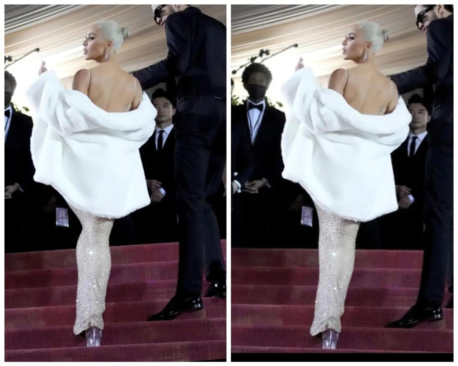 Every single photograph of KK makes her look ridiculously unnatural (the one with the bent knee is the original). Taken at the Met Gala, the photograph shows Kimmy wearing the iconic dress Marilyn Monroe wore when she sangHappy Birthdayto John F. Kennedy in 1962.