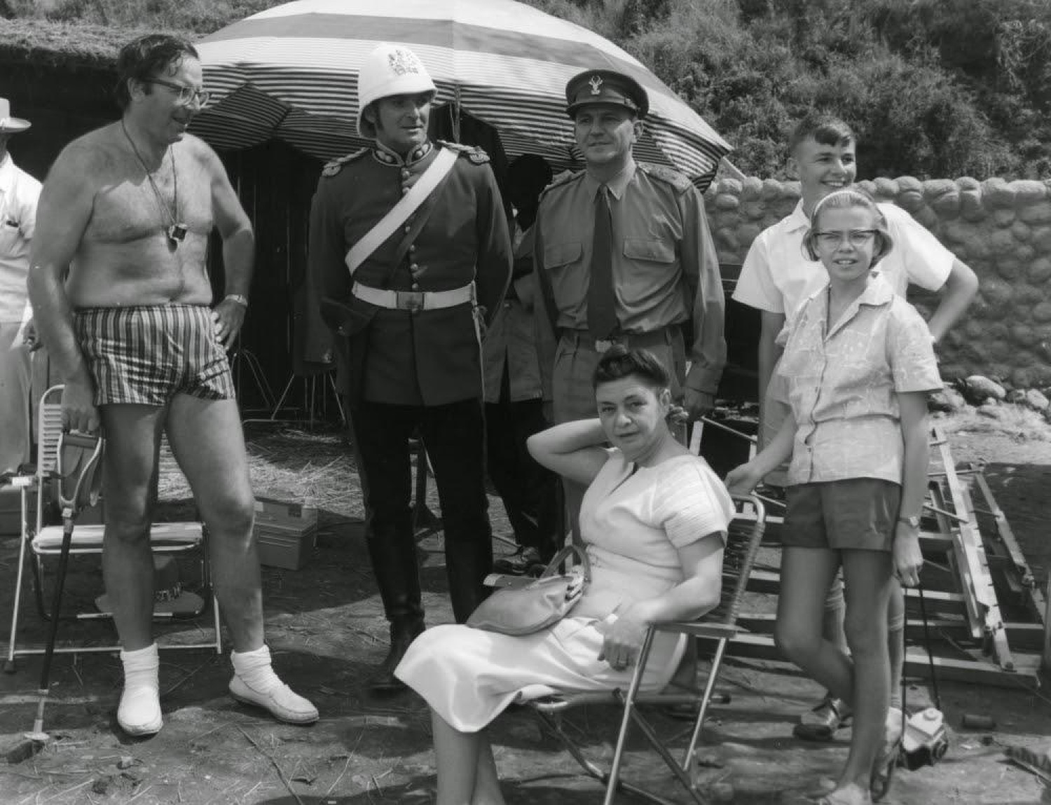 Behind the scenes of Zulu, 1964. Director Cy Endfield dressed for the South African heat in short shorts. Endfield had previously directed Stanley Baker (second left) in the cult truck-driving thriller Hell Drivers (1957).