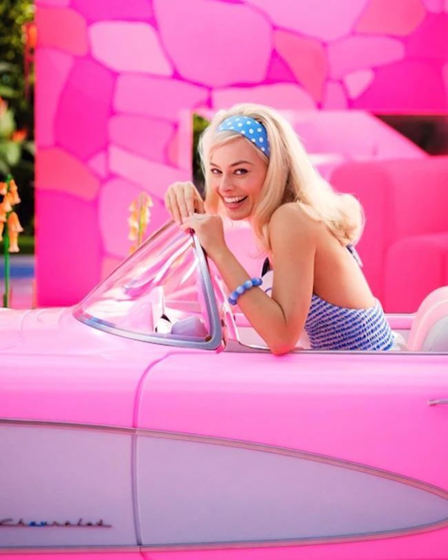 Margot Robbie pictured for the first time as Barbie for the upcoming Barbie movie.