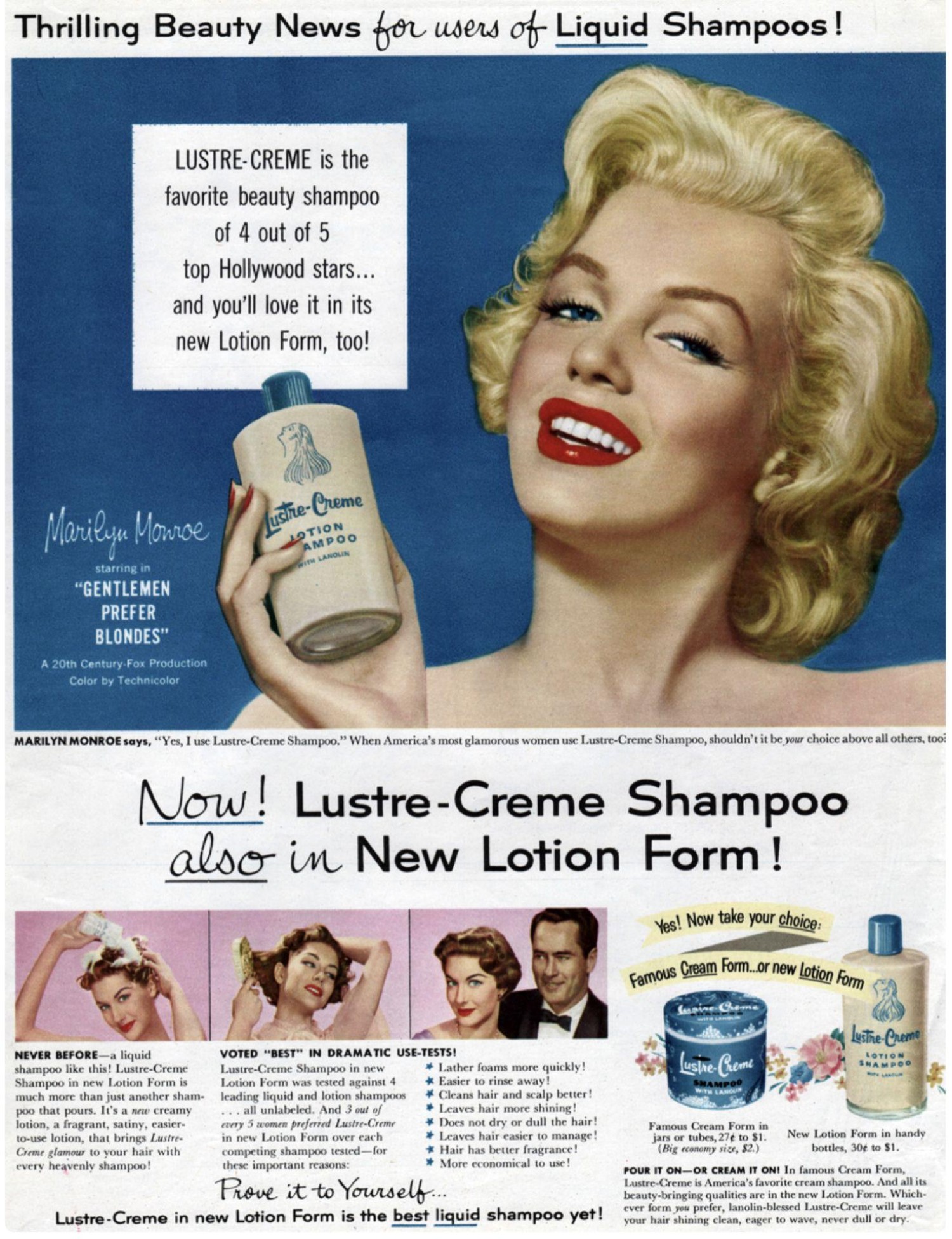 Marilyn Monroe in an advertisement for Lustre Creme shampoo in a September 1953 issue of Modern Screen.