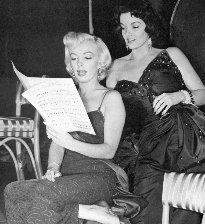 Marilyn Monroe with sheet music and Jane Russell with a Coca Cola on the set of 'Gentlemen Prefer Blondes', early 1953.