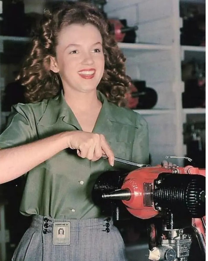 In the spring of 1945, Ronald Reagan sent David Conover to the Radioplane Corporation, manufacturer of radio-controlled aircraft used by the army for anti-aircraft practice. The corporation was owned by Reagan’s friend, Reginald Denny, and was sent there to take pictures of Women in War Work. He moved down the assembly line taking shots of the most attractive employees. He came upon a girl putting on propellers. She had curly ash-blonde hair and her face was smudged with dirt. He snapped and walked on. Then he stopped. He was stunned. She was beautiful.