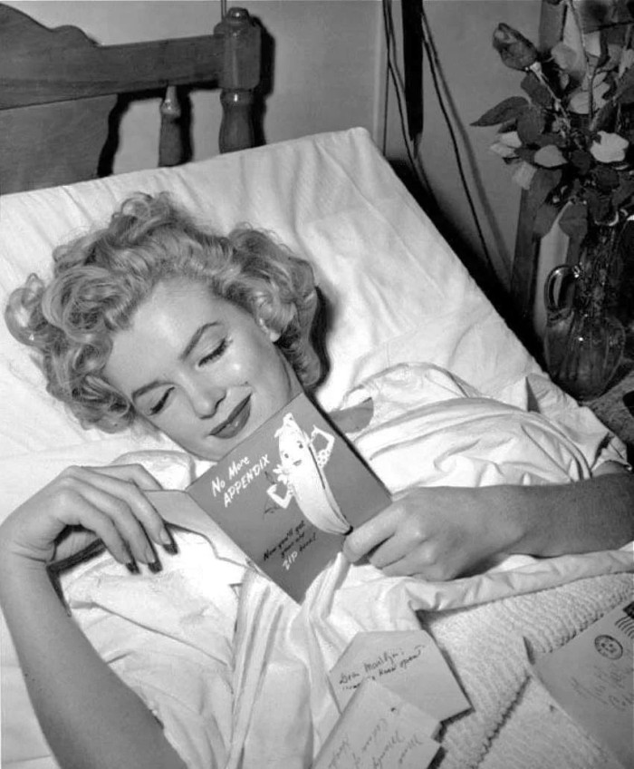 Marilyn Monroe recovering after having had her appendix removed, May 1952.