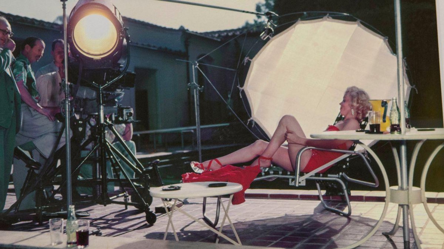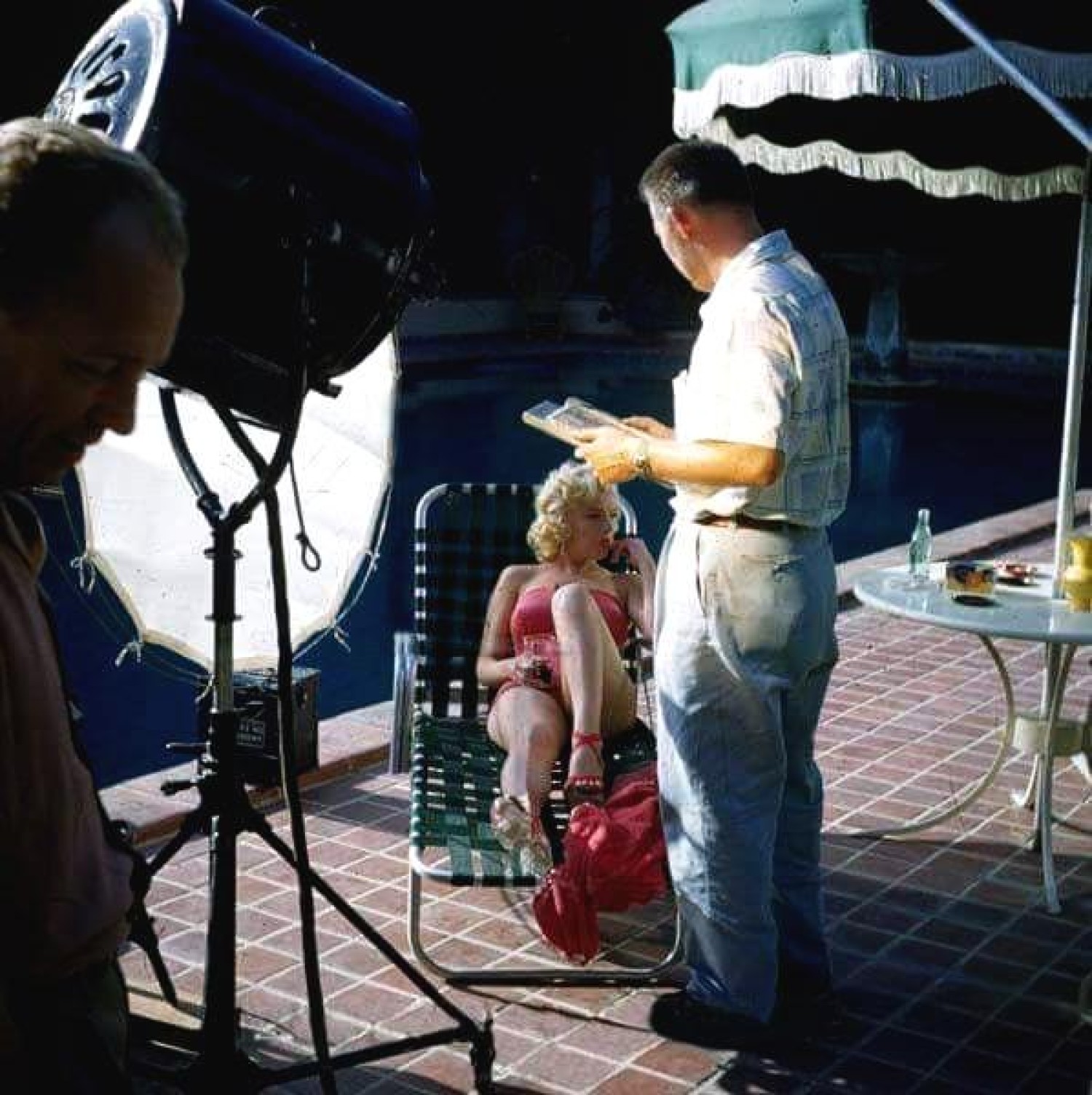 Relaxing on a sun lounger in a Coca-Cola red swimsuit and sky-high glass stilettos strapped on with red ribbons, Marilyn Monroe shoots a TV commercial for Coca Cola (said to be an actual scene from the movie 'Love Nest', 1953) with JackParr.