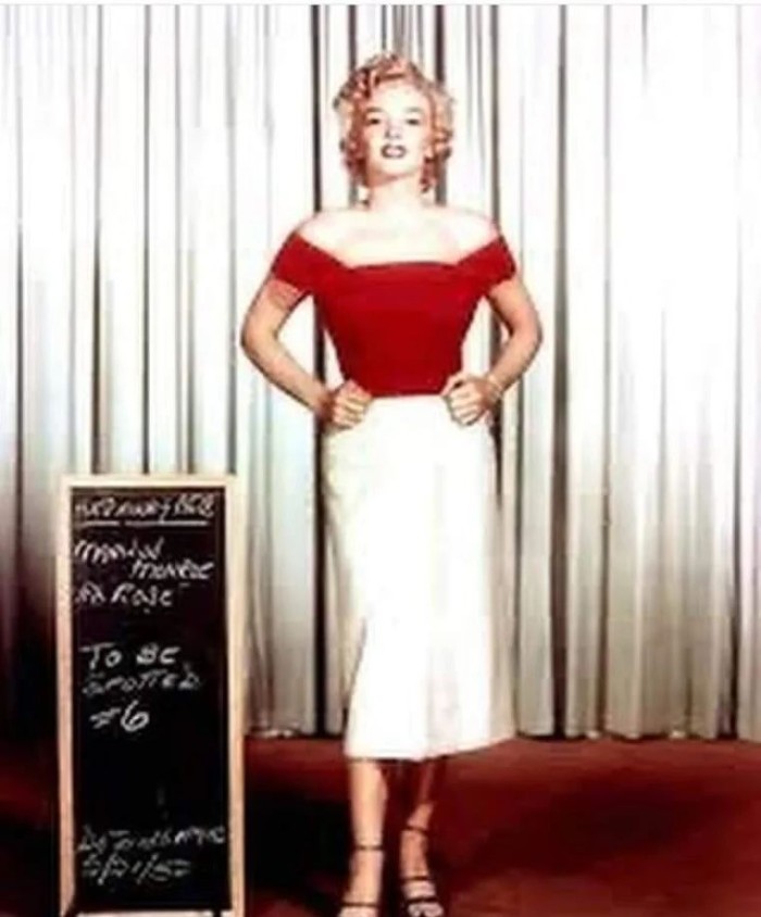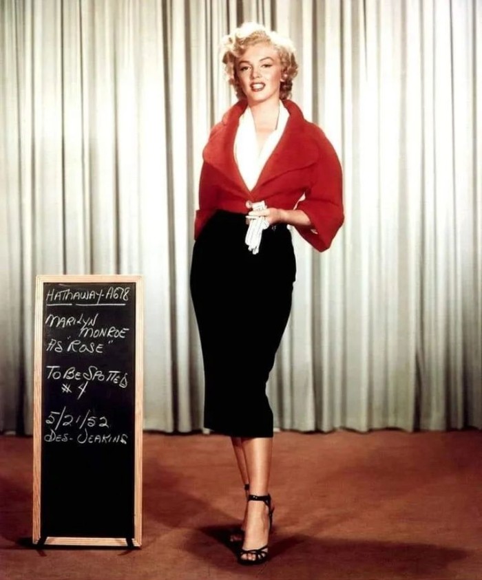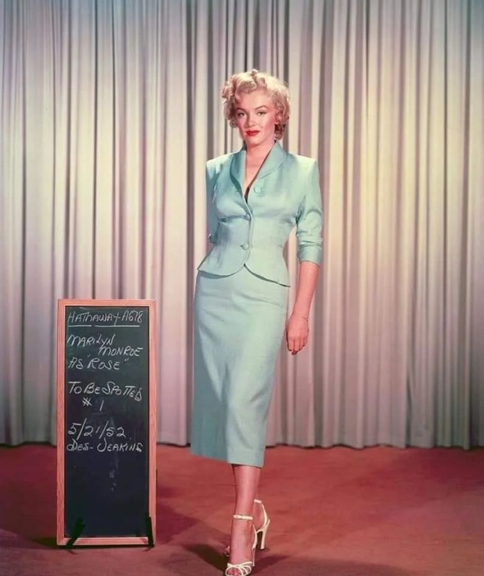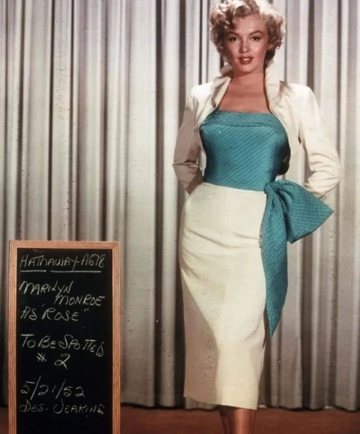 Marilyn Monroe and her wardrobe tests for 'Niagara', 1953.
