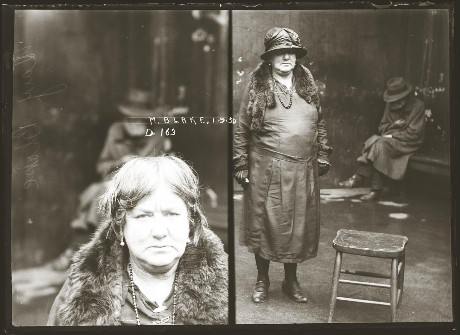 Special Photograph no. D163. The NSW Police Gazette 29 October 1930, p. 827 lists Blake as 'charged with having cocaine unlawfully in her possession.' She was sentenced to 12 months imprisonment and fined 250 pounds.