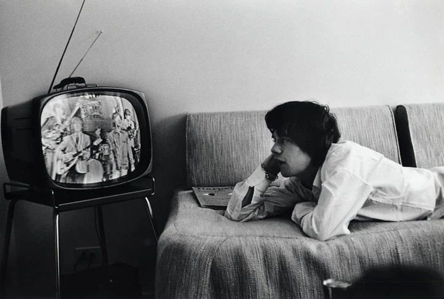 Mick Jagger reclining on a day bed in a hotel room watching the rebroadcast of The Rolling Stones appearance on The Red Skelton Show, November 10th, 1964.